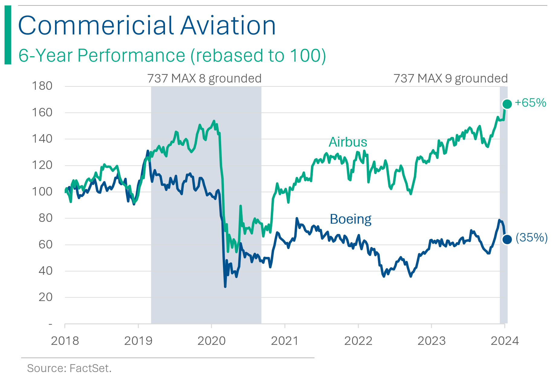 While the MAX 9 door ‘plug’ incident was shocking, it wasn’t the first time in recent years the company has faced adversity. Recall back in 2019, the launch of the MAX 9’s predecessor - the MAX 8 - led to two separate crashes (in which 346 people died) linked to an autopilot issue. What’s clear is that, anything bad that happens to Boeing is good for Airbus.