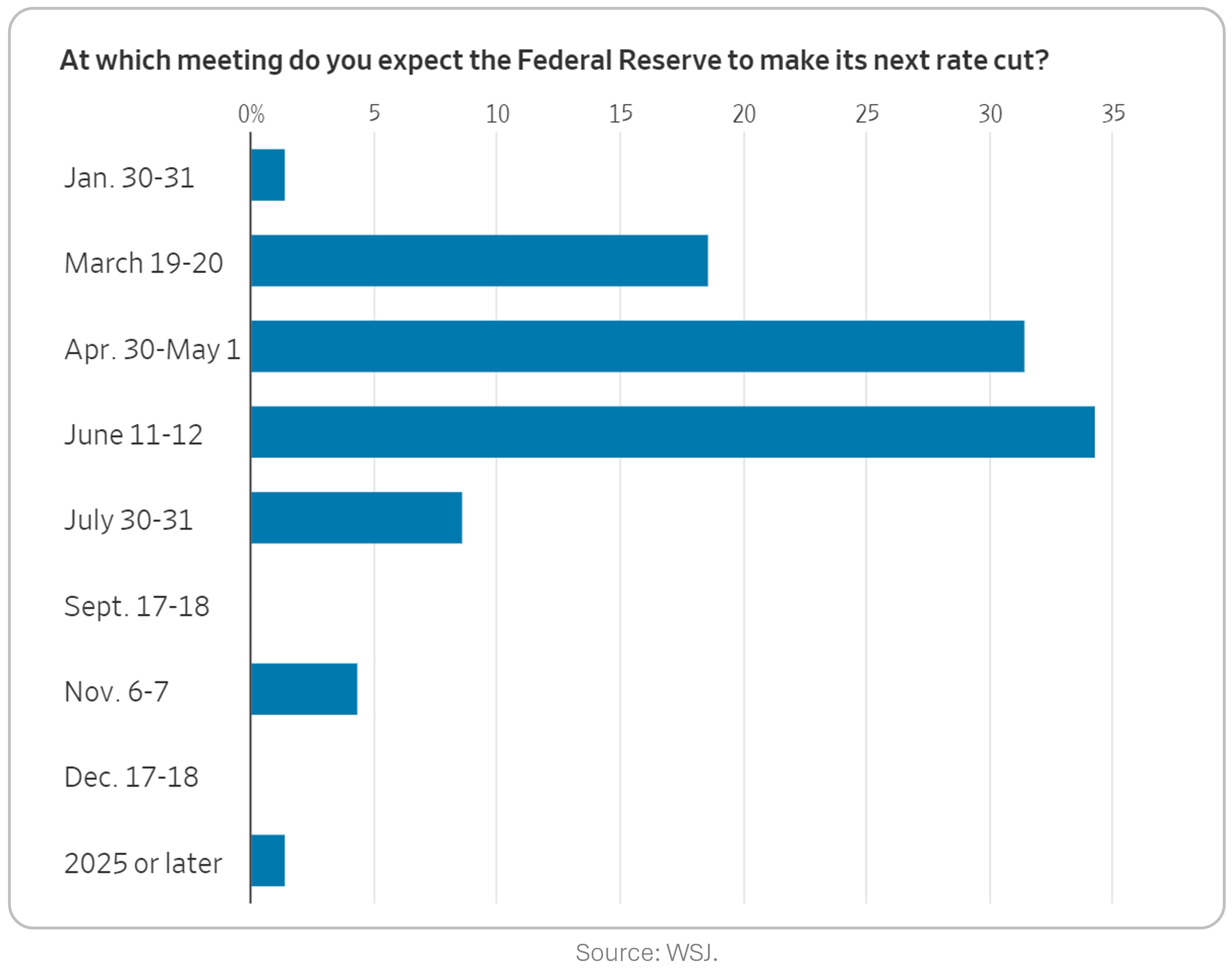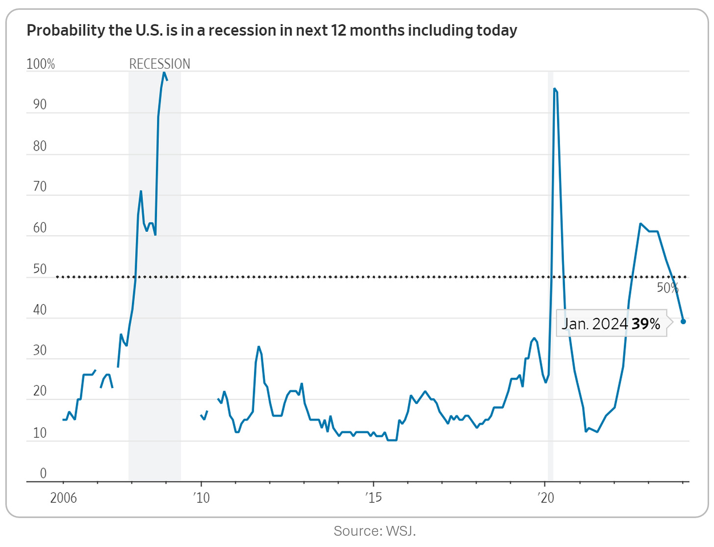 According to The Wall Street Journal's survey of economists, the probability of a recession in the next year has decreased to 39%, with expectations of modest economic growth at 1% in 2024, but the pace of job creation is predicted to slow significantly. Despite this slowdown, the unemployment rate is expected to rise only slightly to 4.3% by the end of the year, and inflation is projected to decrease to 2.3%. The Federal Reserve is anticipated to make one or two quarter-percentage point rate cuts by mid-2024, with markets and economists divided over the timing of these cuts. Good thing economists are never wrong. (Here’s the full story)