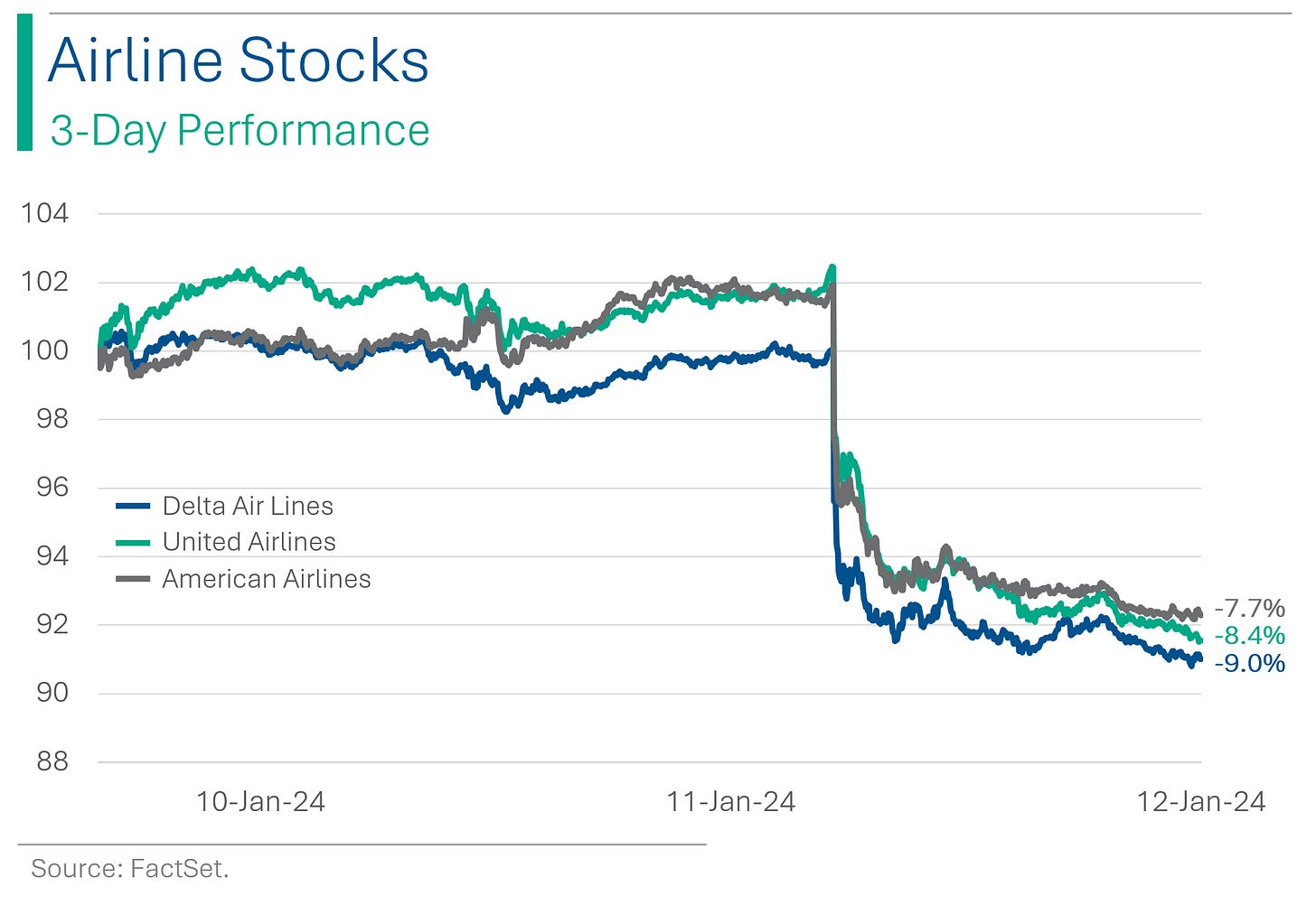 Delta Air Lines reported Q4 earnings on Friday. Quarterly profit was doubled with record revenue in 2023, driven by strong travel demand, especially for international flights. BUT, the company came across rather bearish on the travel industry in the coming year, coupled with a weak EPS guidance. As a result, the stock got hammered, and took it’s peer group with it. Just when I was getting used to airlines - which have underperformed the market massively since the pandemic started - not sucking anymore.