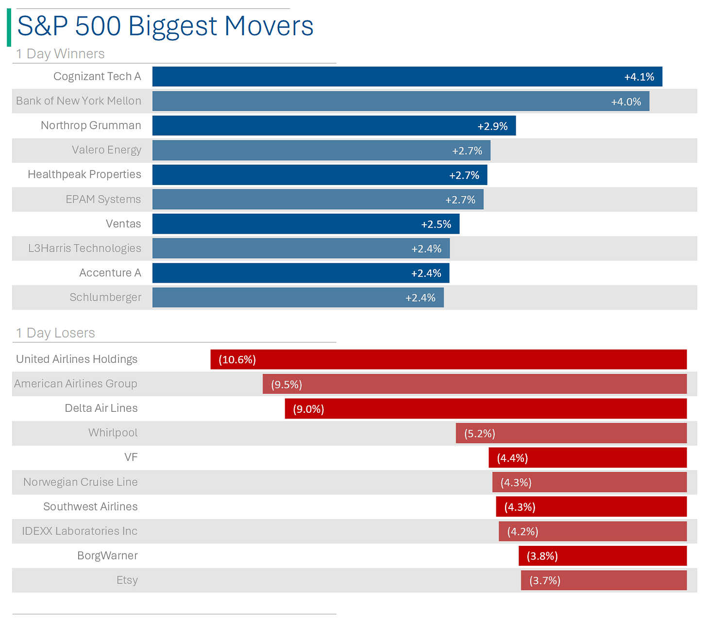 Bank of New York Mellon (BK) [+4.0%]: Q4 earnings per share (EPS) and revenue exceeded expectations, excluding one-time charges. Quarterly revenue increased by 10%, with net interest revenue boosted by higher interest rates.