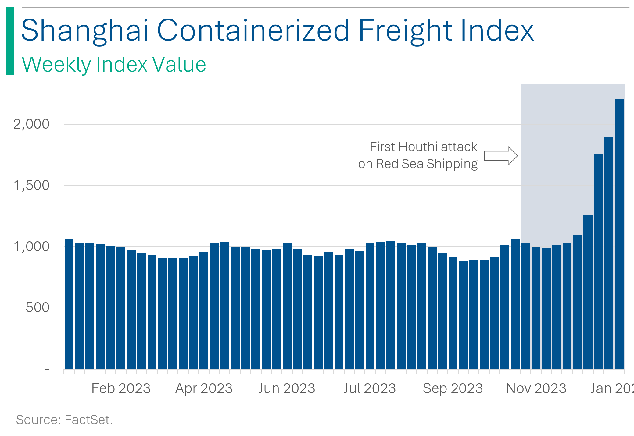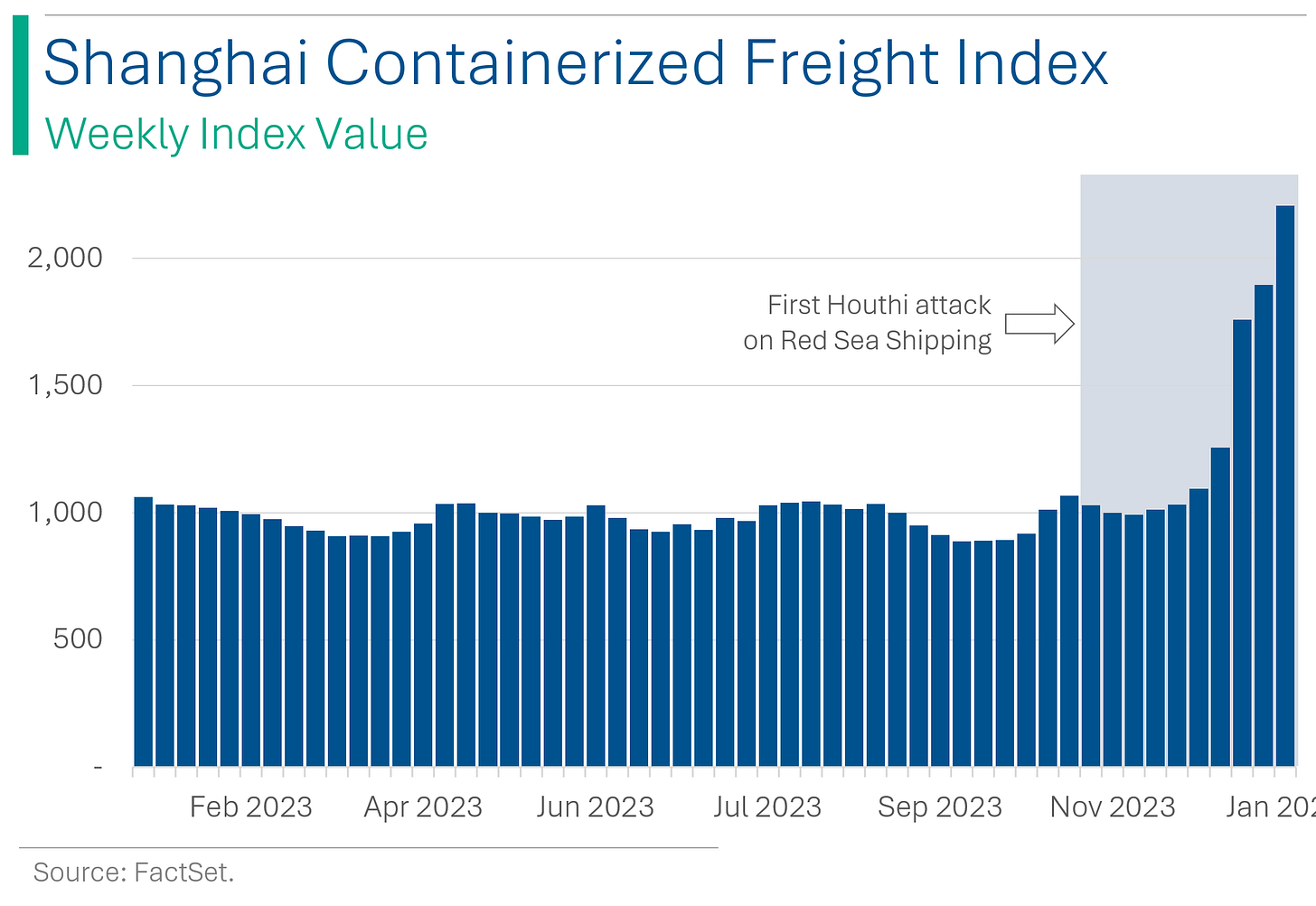 Container shipping rates have significantly increased due to U.S. and UK air strikes on Yemen, raising concerns about disruptions in the Red Sea, a crucial global trade route. The Shanghai Containerized Freight Index, a key indicator of shipping rates out of China, rose by 16% in a week. Moreover, automaker Stellantis announced that it has resorted to airfreight to cope with disruptions, while Tesla has been forced to pause most production at its Germany plant due to a lack of parts. Industry experts warn that prolonged conflict could lead to further disruptions in global shipping and a potential rise in global inflation. (Reuters and the WSJ have more)