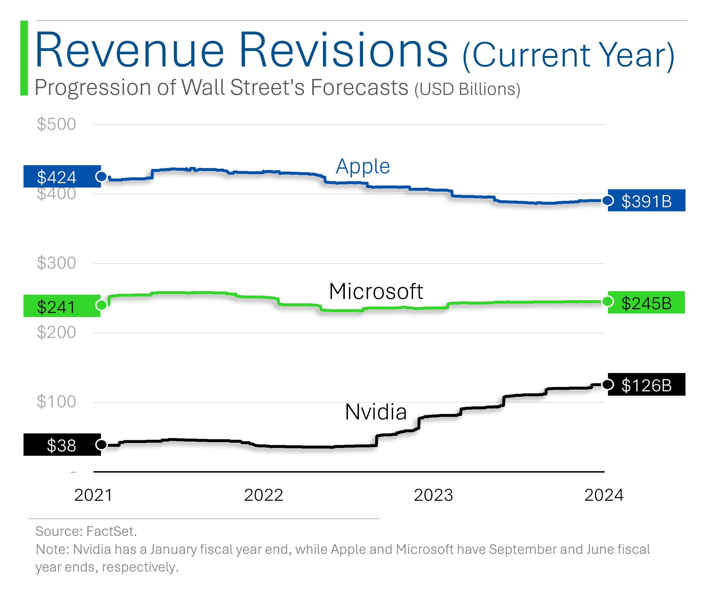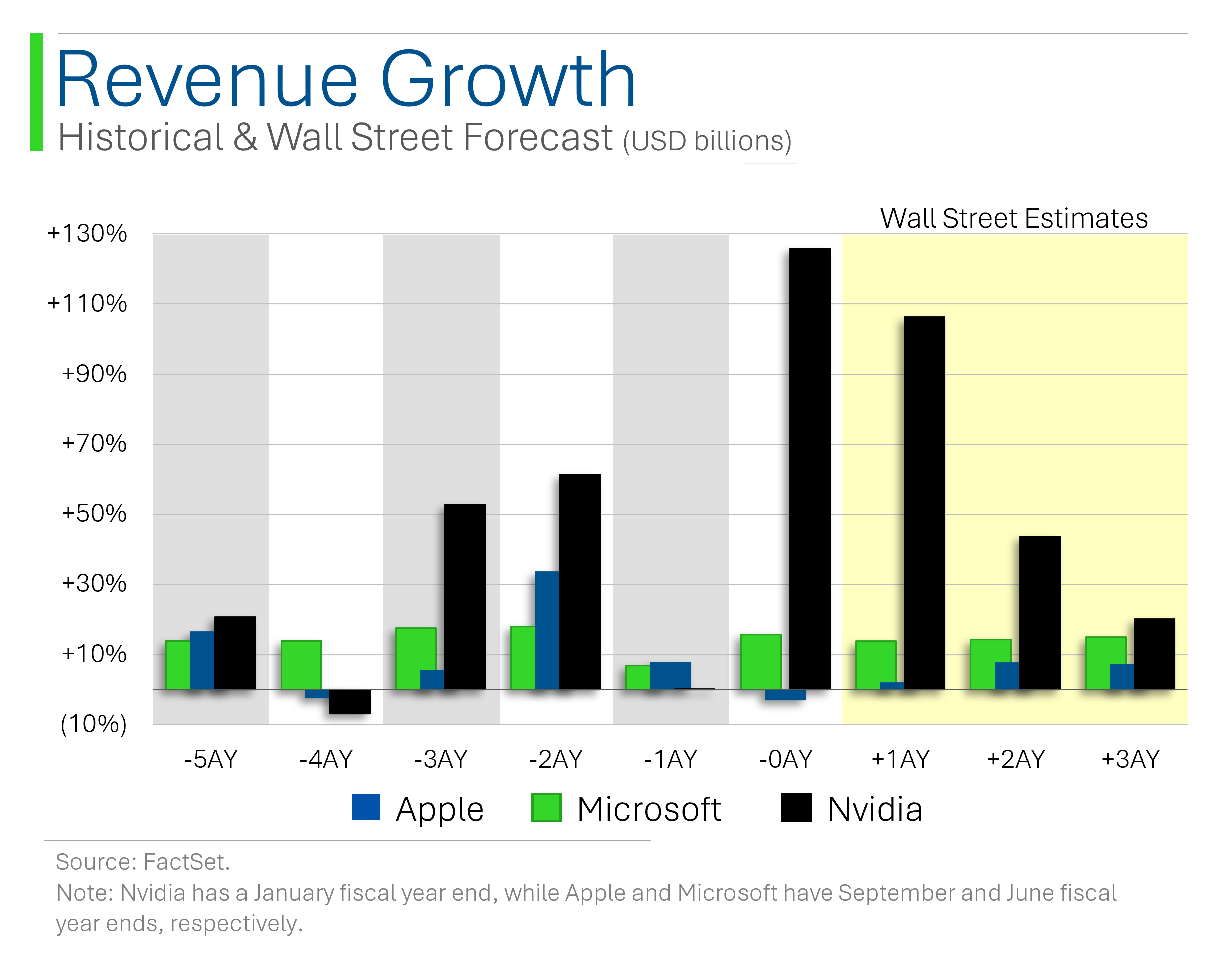 For example, Wall Street estimated their current year Revenue (FY2025) at only $38 billion a few years back, now that figure is sitting at $126 billion (+230%). Meanwhile estimates for Apple (-8%) and Microsoft (+2%) havenāt been as hyped.