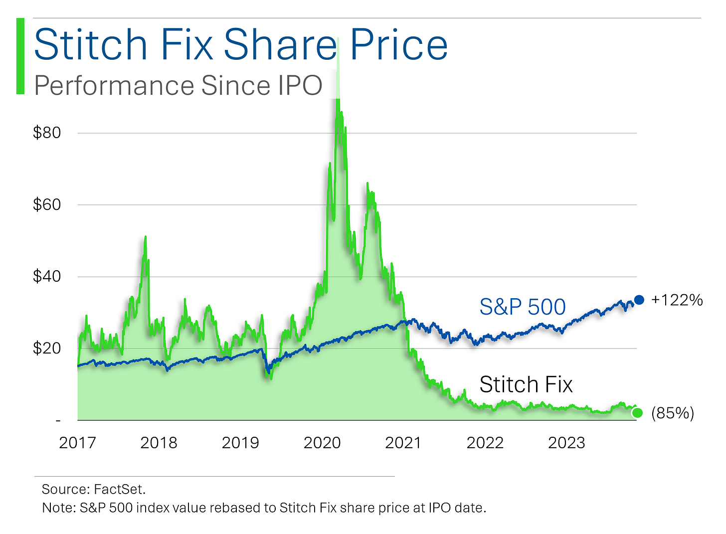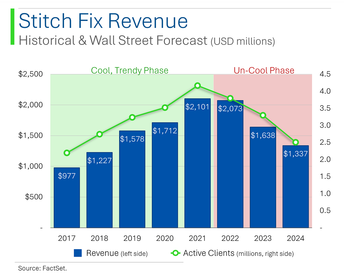 Former techy unicorn Stitch Fix continued its plunge into irrelevance after flopping another quarter yesterday, power-bombing the shares down 39.5%. In a rare feat, the company actually beat on EBITDA, but guidance was less than optimistic. 2024 Revenue also continued itās downward slide, while users continued their exodus from the platform.