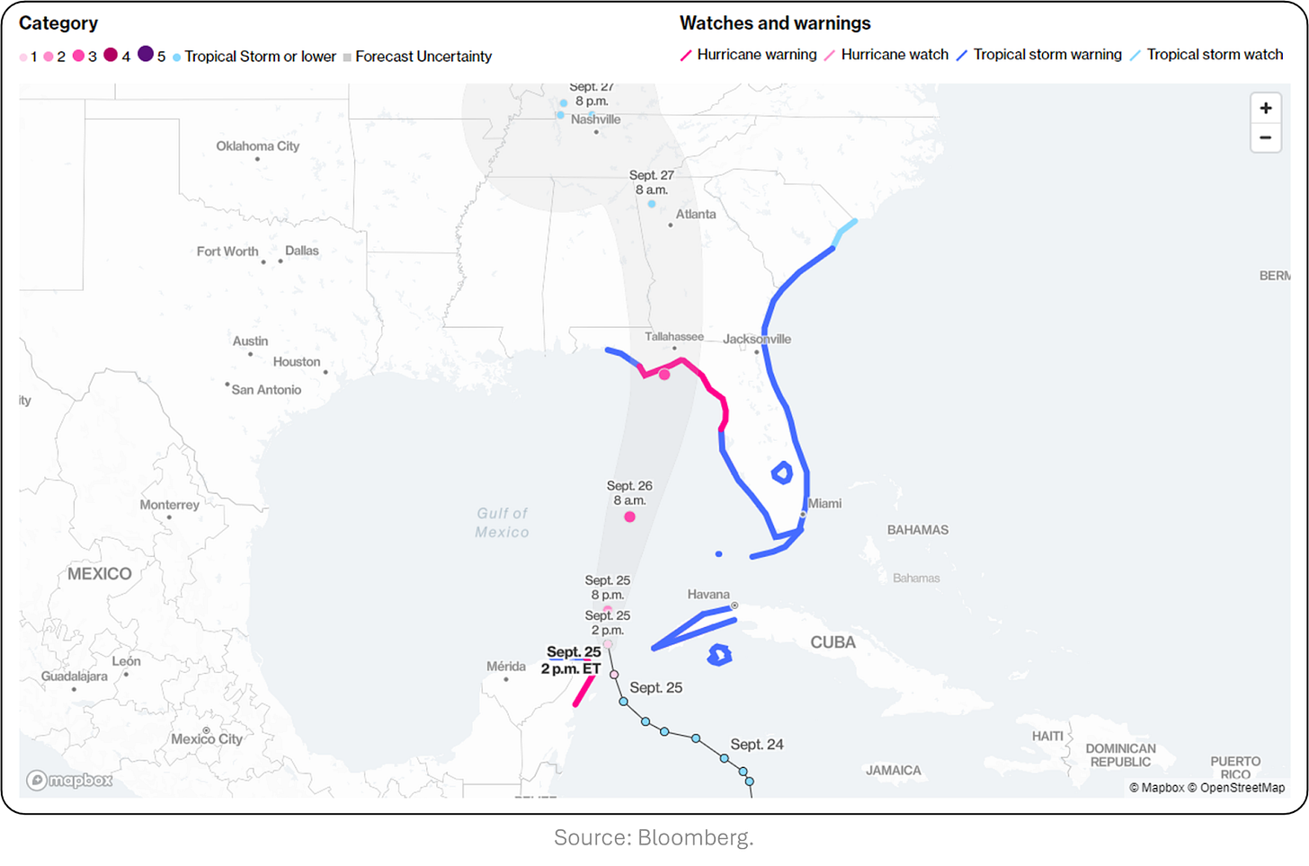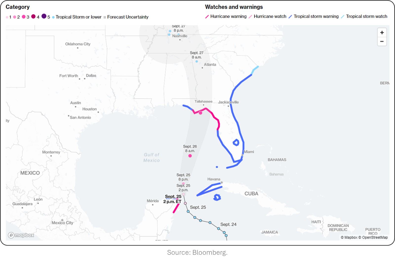 BloombergĀ / Tracking Heleneās latest path. The hurricane is moving past Cancun and is heading toward Florida's Panhandle with winds reaching 85 mph. Furthermore, forecasts suggest the storm will strengthen into a Category 3 with 120 mph winds and that up to 20 inches of rain could hit parts of Florida.