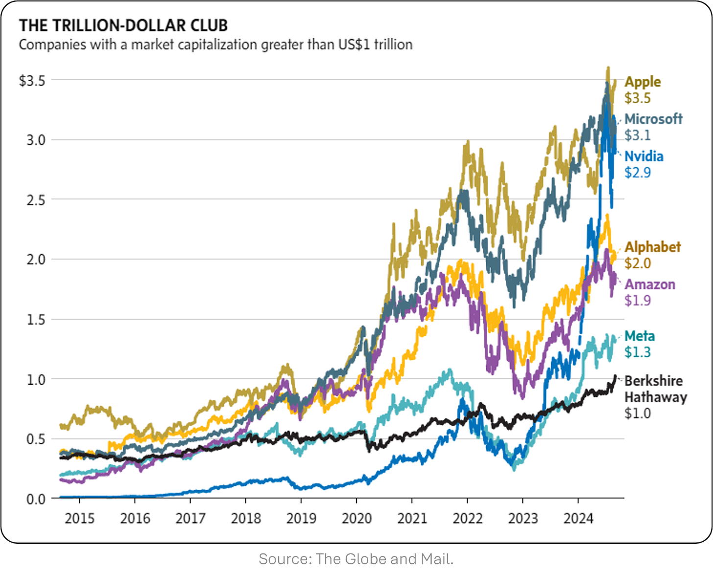 The Globe and MailĀ / The $1-trillion club: Berkshire Hathaway finally joins exclusive group. Historically avoiding tech, Buffettās late pivot to Apple and Amazon paid off, pushing Berkshire into rarefied air. To grasp the scale: $1 trillion equals 60% of Canadaās GDP. Good job Warren, itās about time!