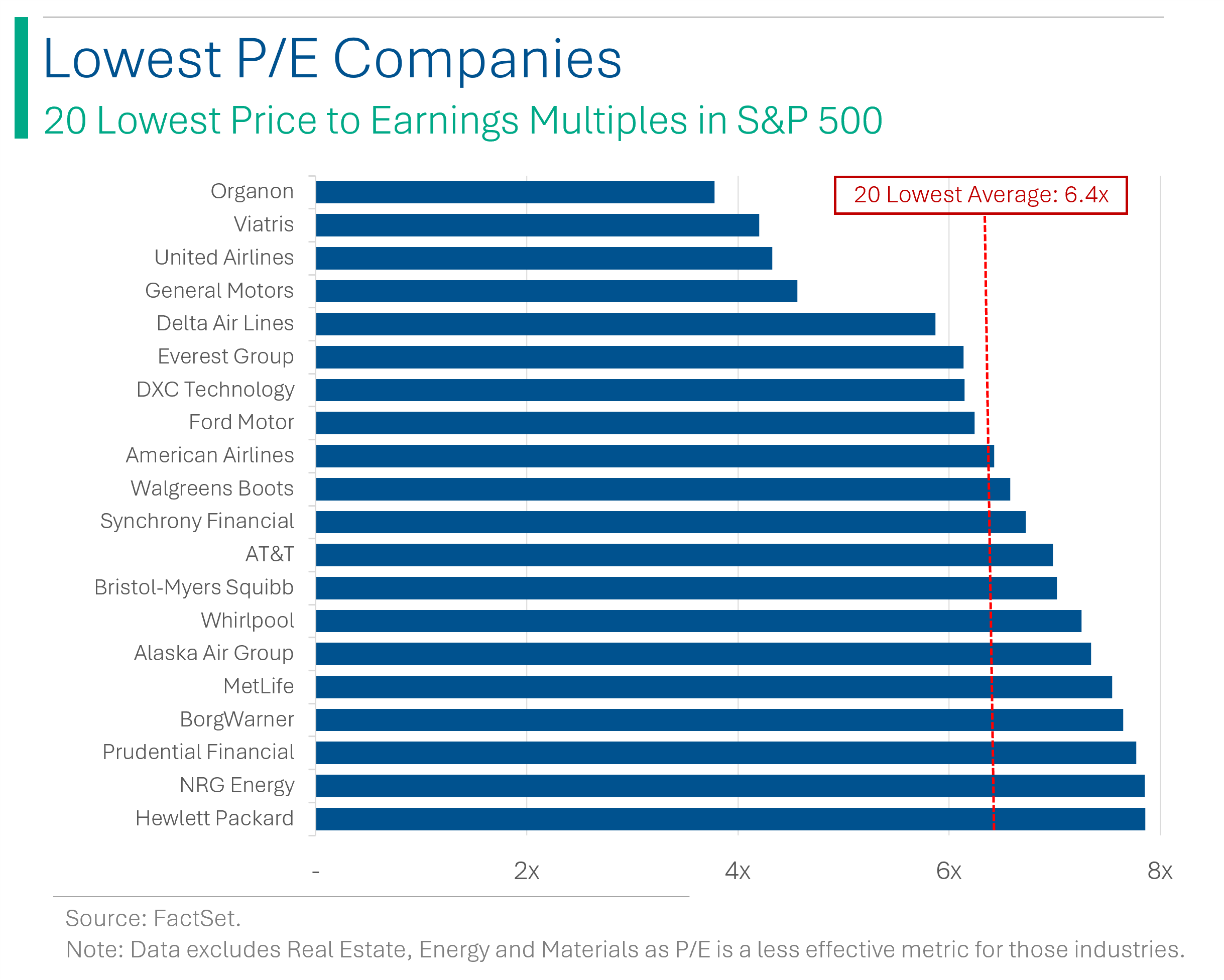 As you can see below, the ‘cheapest’ 20 companies average a forward P/E ratio of around 6.4x - a 69% discount to the S&P average of around 20.6x.