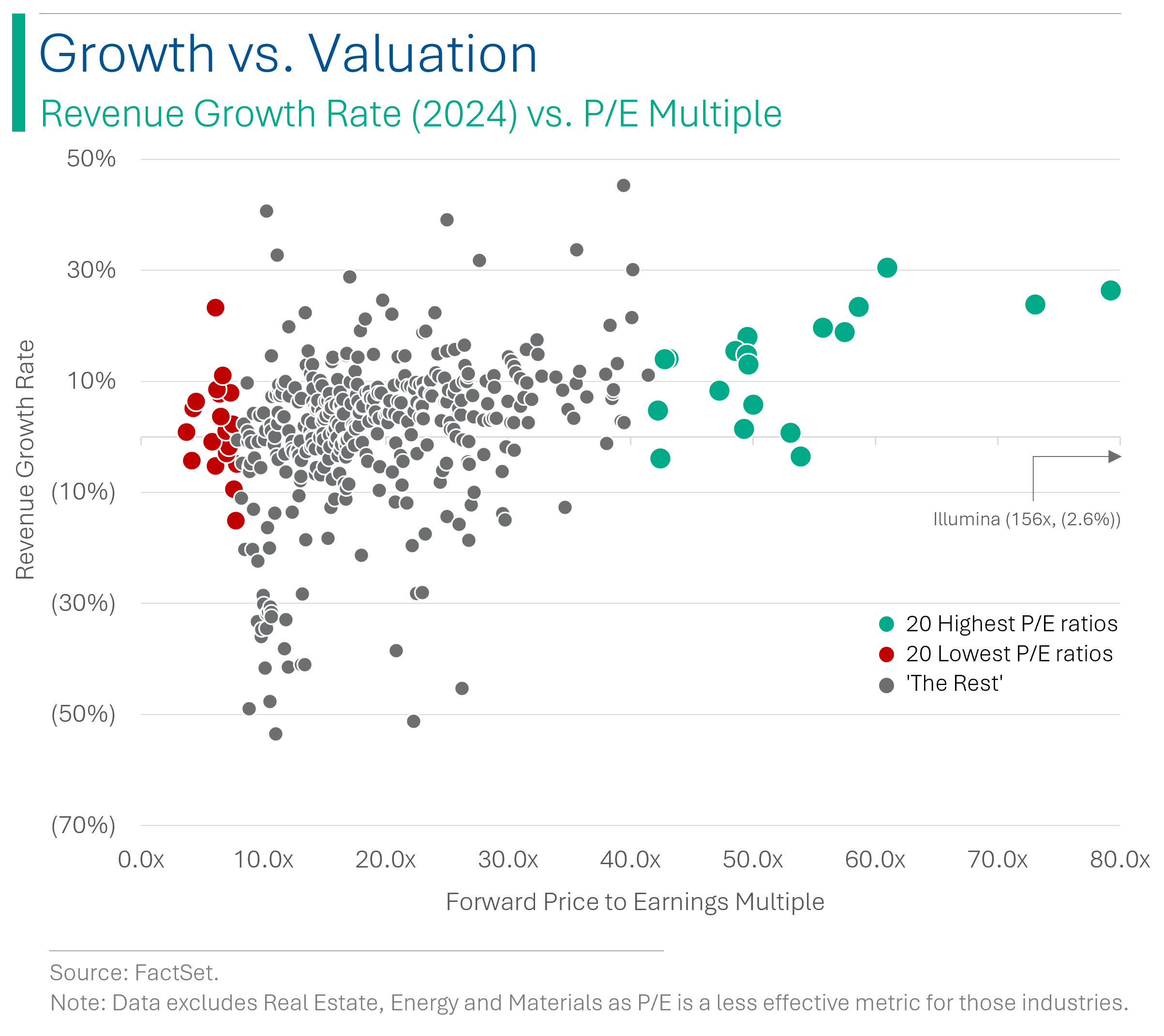 To tie it all in; the market isn’t stupid. There are some weird exceptions, such as genomics company Illumina trading at 156x but expecting negative revenue growth this year (it’s been a ‘3 years out’ story for the last decade), but generally the companies growing the fastest seem to trade at the highest multiples, and the opposite for the slowest ones.