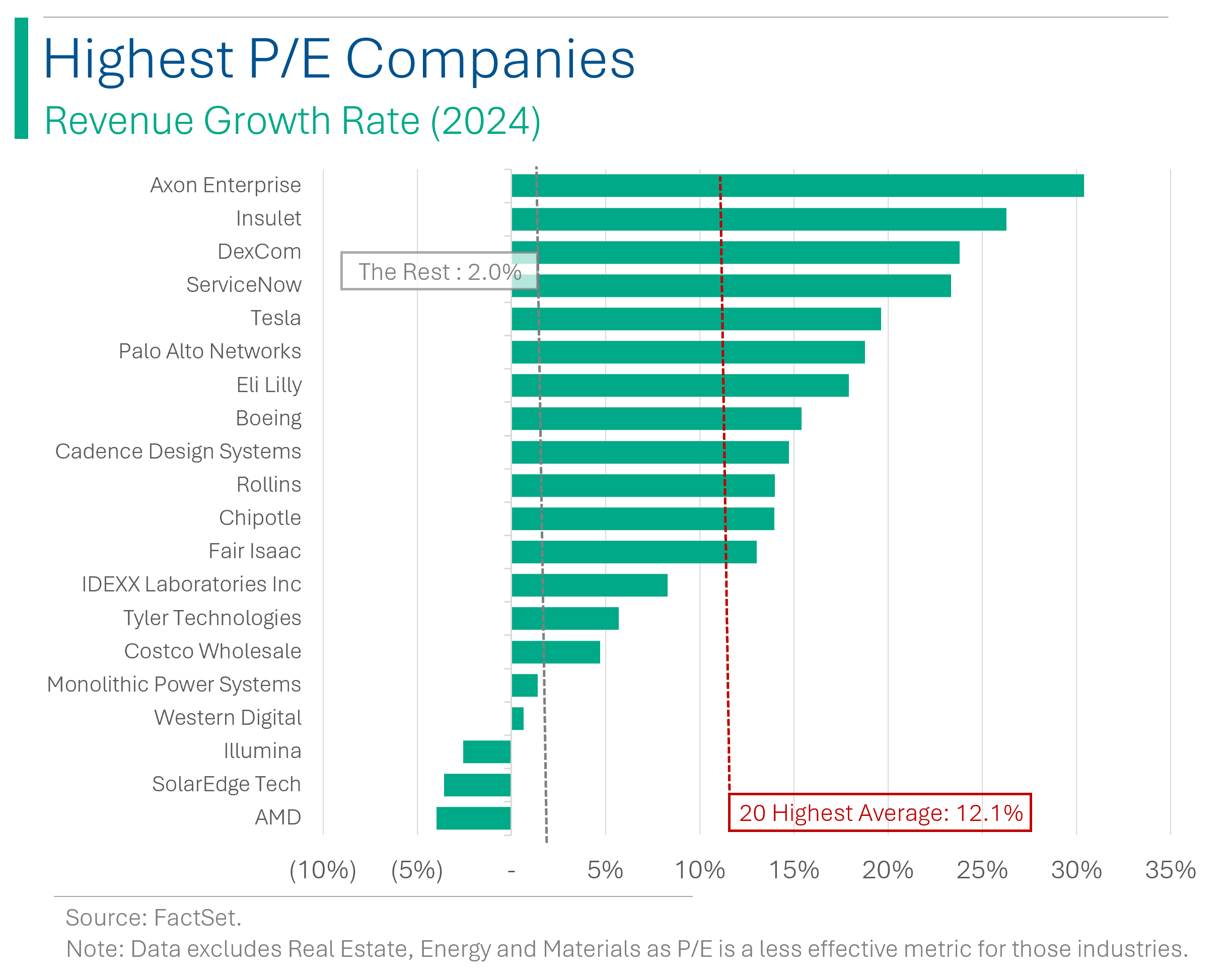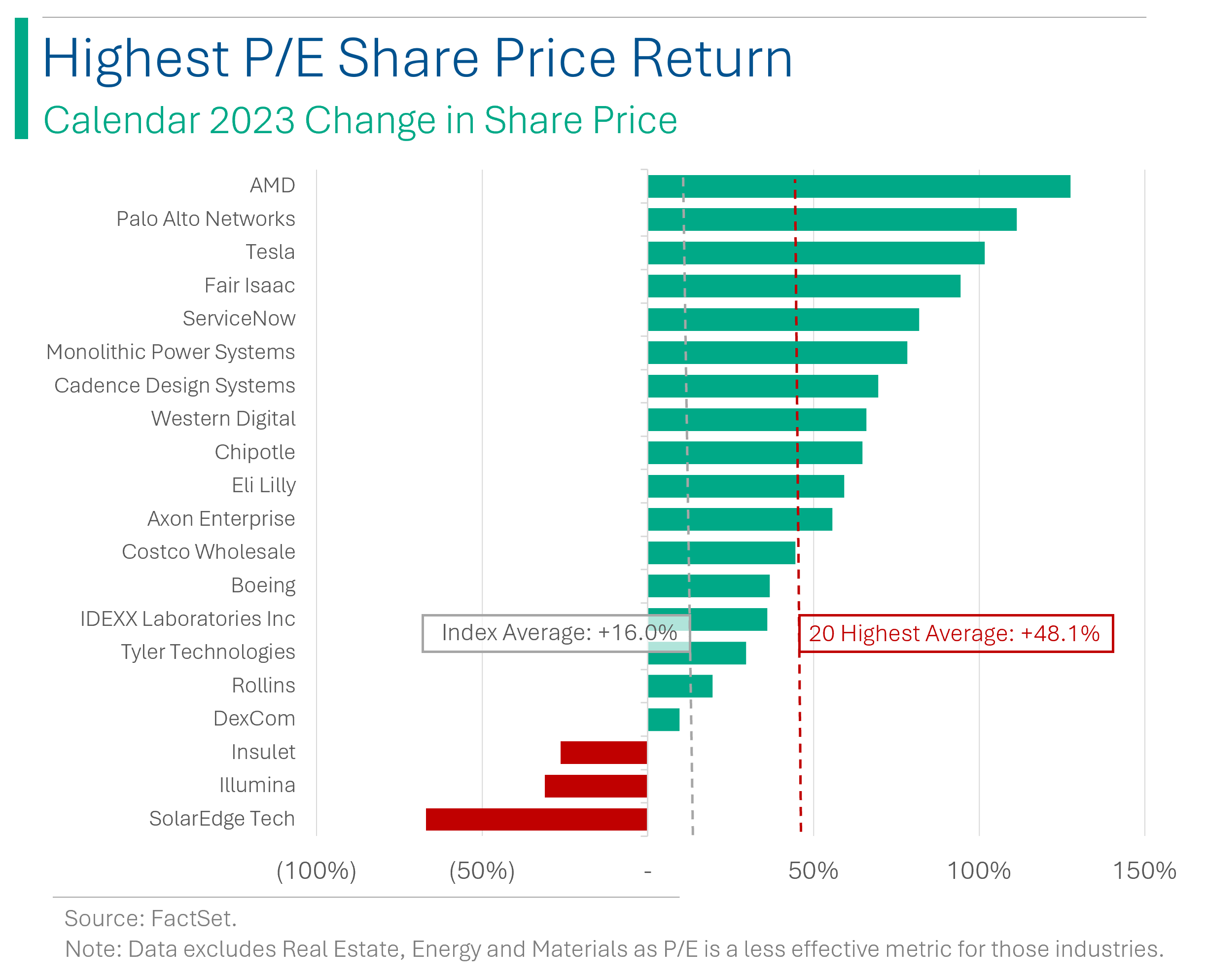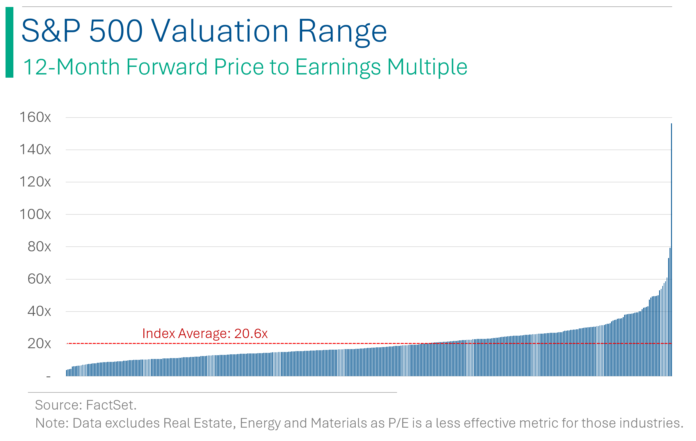 On the other end of the spectrum, the 20 highest P/E stocks average around 58.2x, or a 183% premium to the index average 20.6x.