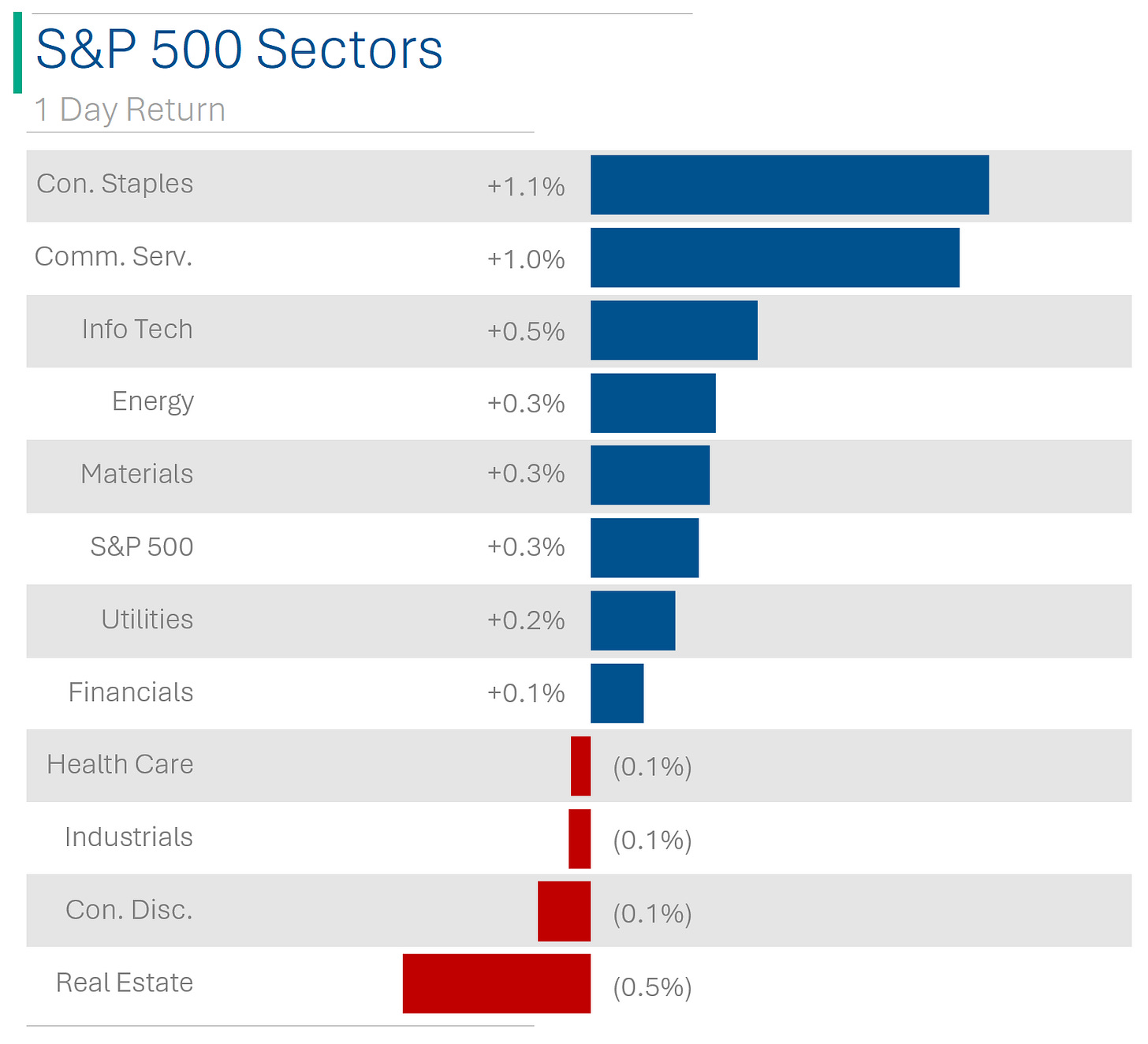 7 of 11 sectors closed up, lead by Consumer Staples (+1.1%). Real Estate proved the weakest, down -0.5%.