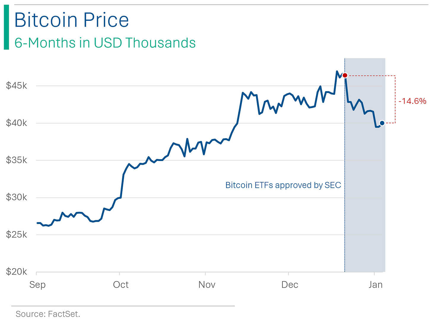 Since Bitcoin ETFs got the greenlight from the SEC on January 10th, it hasn’t been pretty. I’ve written in the past how ‘catalysts’ are important for stocks, which I presume translates into crypto. After a big event, like say an M&A deal or a biotech drug approval, investors can be left sitting on their hands waiting for the next thing that will move the share price. And for Bitcoin, it’s not exactly like these are the long-term, buy-and-hold type. The next catalyst for Bitcoin is likely the next ‘Halving’ event, when the block rewards for mining Bitcoin will be cut in half. And that’s not until April.