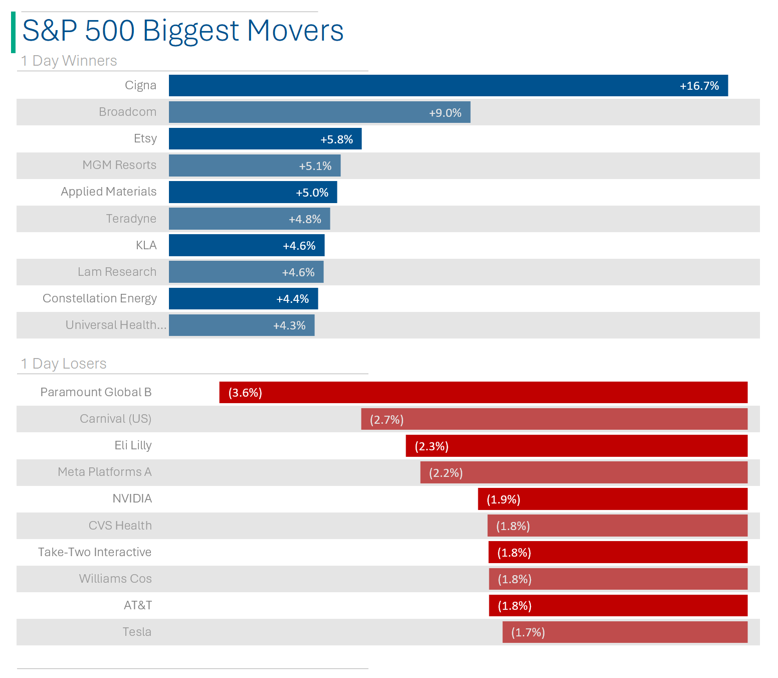 The Cigna Group (CI) [+16.7%]: Ended merger talks with HUM over financial disagreements; announced a $10B repurchase program and received an upgrade to buy at Jefferies.