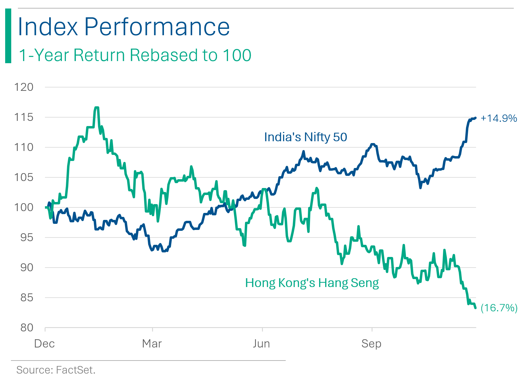 INDIAN STOCK RALLY - India's National Stock Exchange has surpassed Hong Kong's in market value, becoming the world's seventh largest with a capitalization of $3.989 trillion. The Nifty 50 index in India has seen a near 16% increase this year, contrasting with Hong Kong’s Hang Seng index's 18% decline. Economic optimism in India, driven by factors like increased liquidity and positive global macro trends, is high as the country approaches its 2024 general elections, with expectations of a continued Bharatiya Janata Party government. In contrast, Hong Kong faces challenges due to its ties to mainland China, with a downgraded economic outlook and expectations of moderate growth in the coming years.