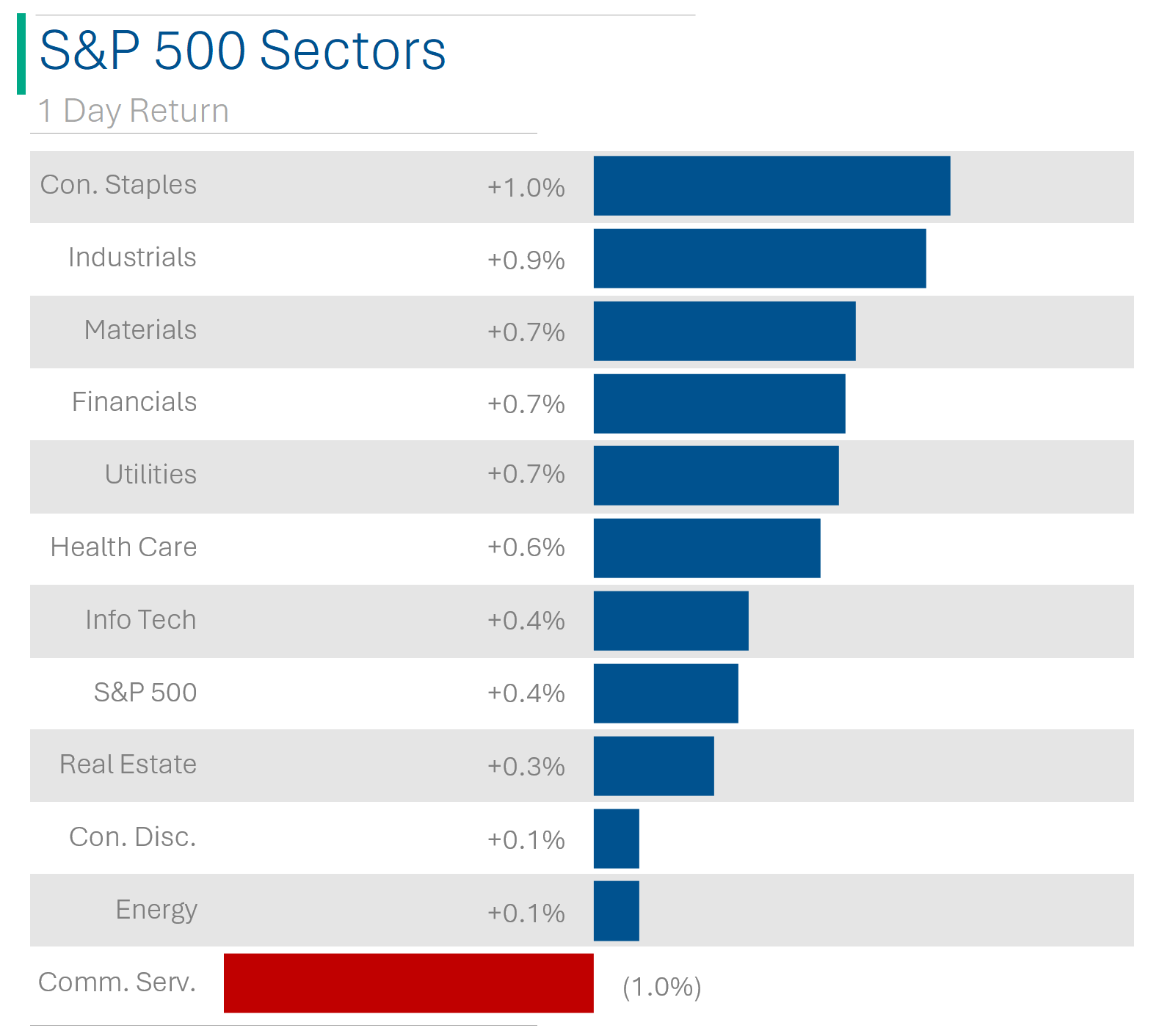10 of 11 sectors closed in the green with Staples (+1.0%) and Industrials (+0.9%) leading the way. Only Communication Services (-1.0%) was out of step.