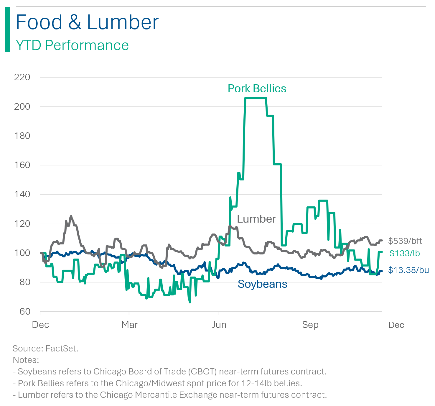 Pork Bellies went on a wild ride this year, mostly due to speculation for inflation in things like feed. Important to note is that current prices in the $130 range are still a far cry from their 2021/2022 average in the +$200 range.