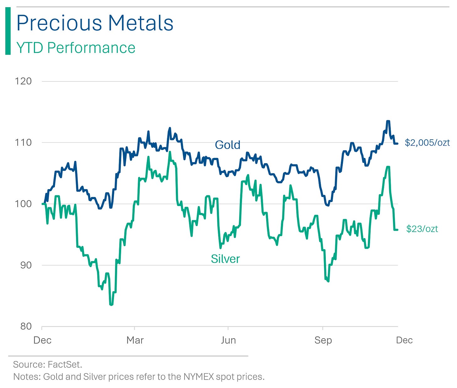 Iron Ore has had a standout year but it’s worth noting that during the pandemic prices peaked at around $220 per metric ton. Around 50% of iron is used in construction, which appear to be picking back up due to the ‘soft landing’ narrative but the supply/mining side is a bit more complicated.