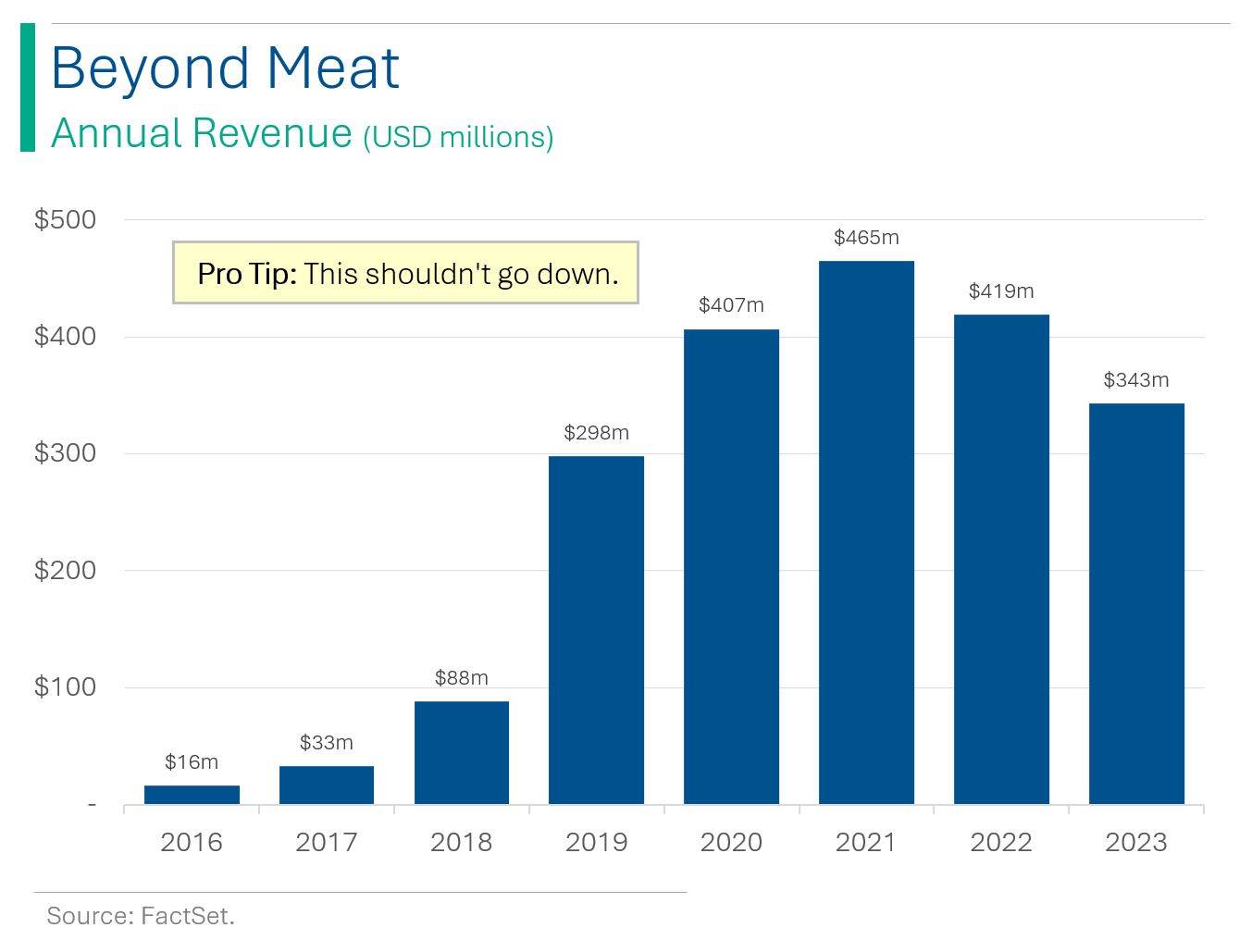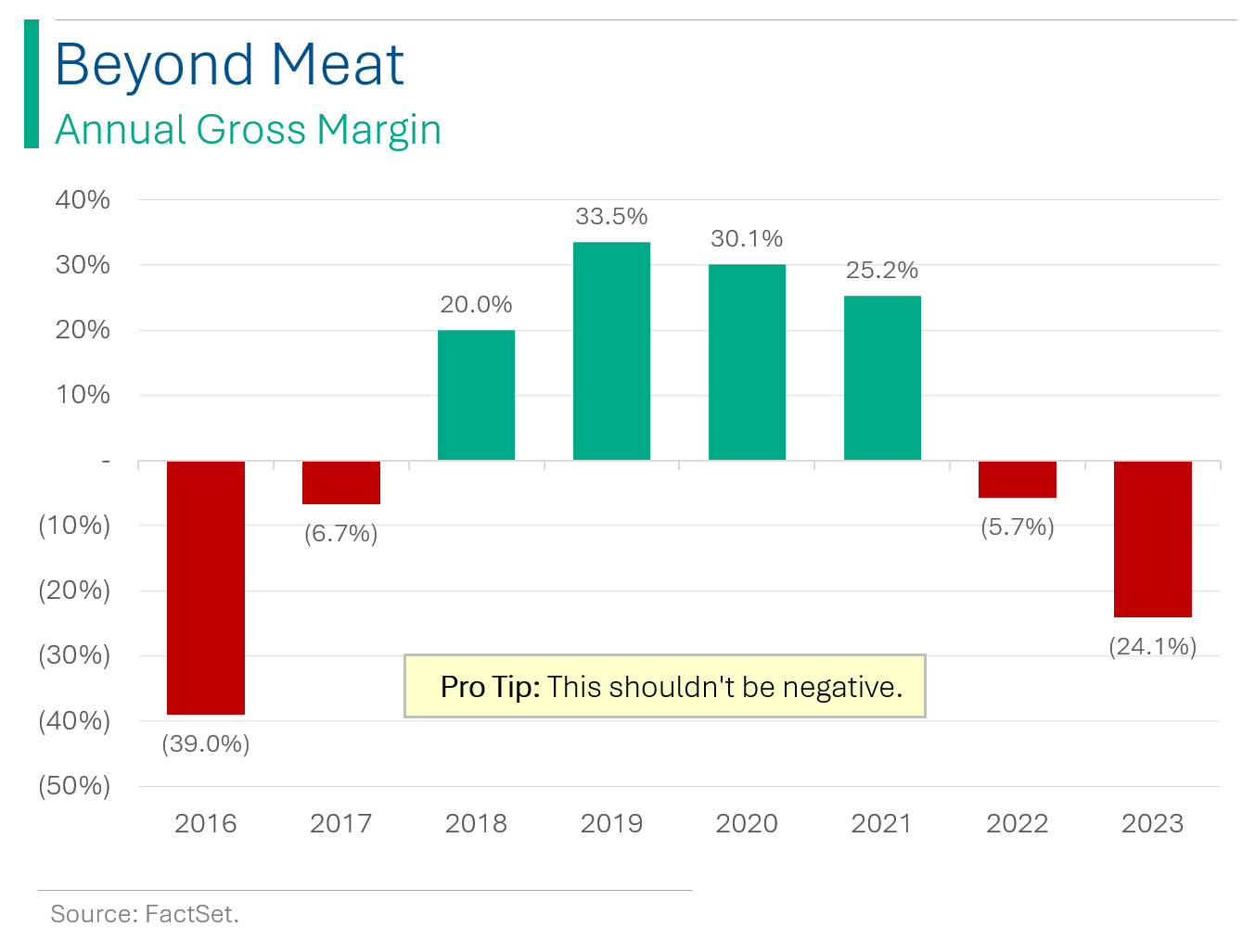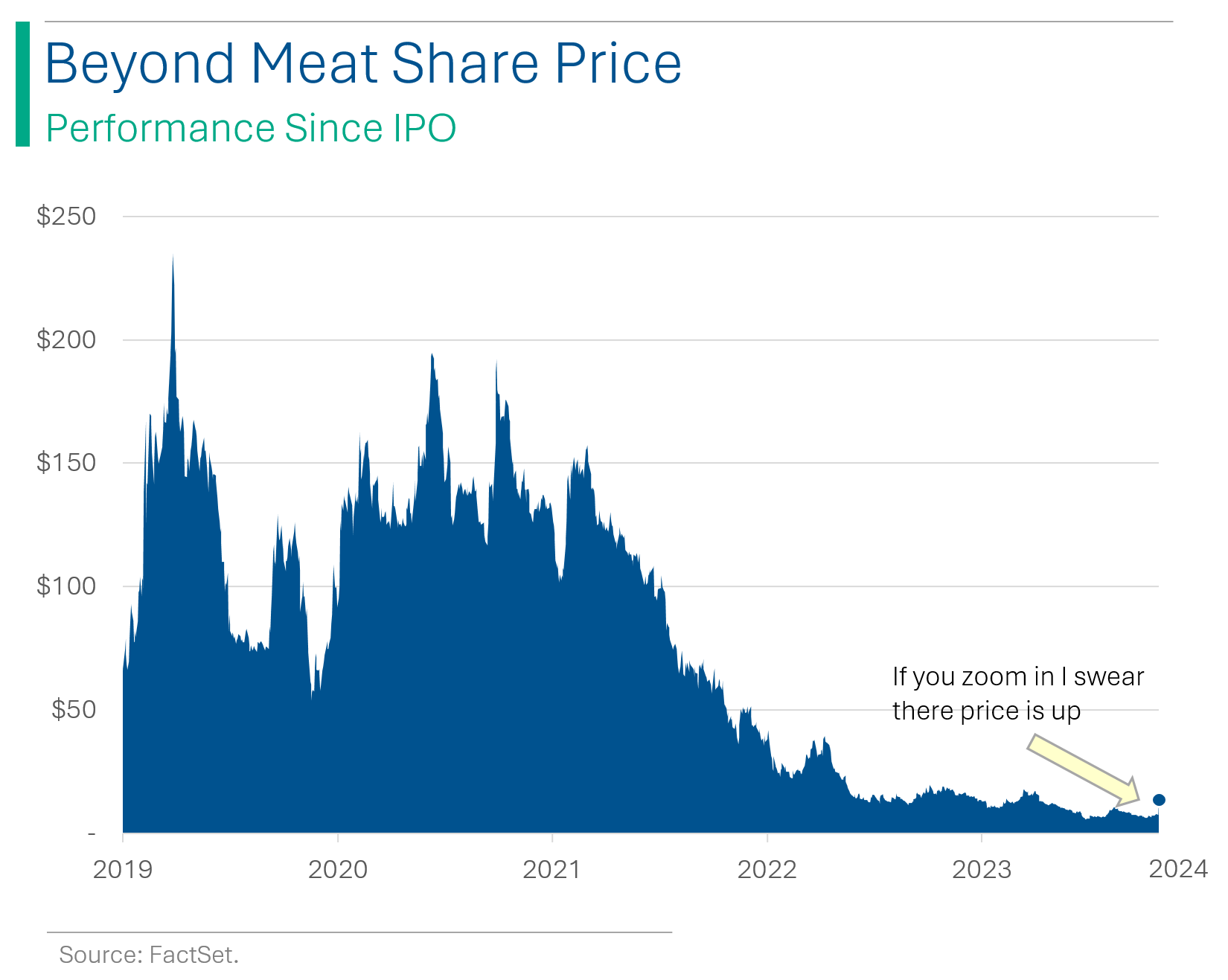 What happens when your company reports annual revenues down 18% YoY, soft 2024 guidance and an EPS figure that I’m not sure is comparable to estimates because of all the accounting ‘one-time’ charges they’ve accrued? Well, if you’re Beyond Meat, then your share price goes up 74%. Qu’est-ce que le f***?