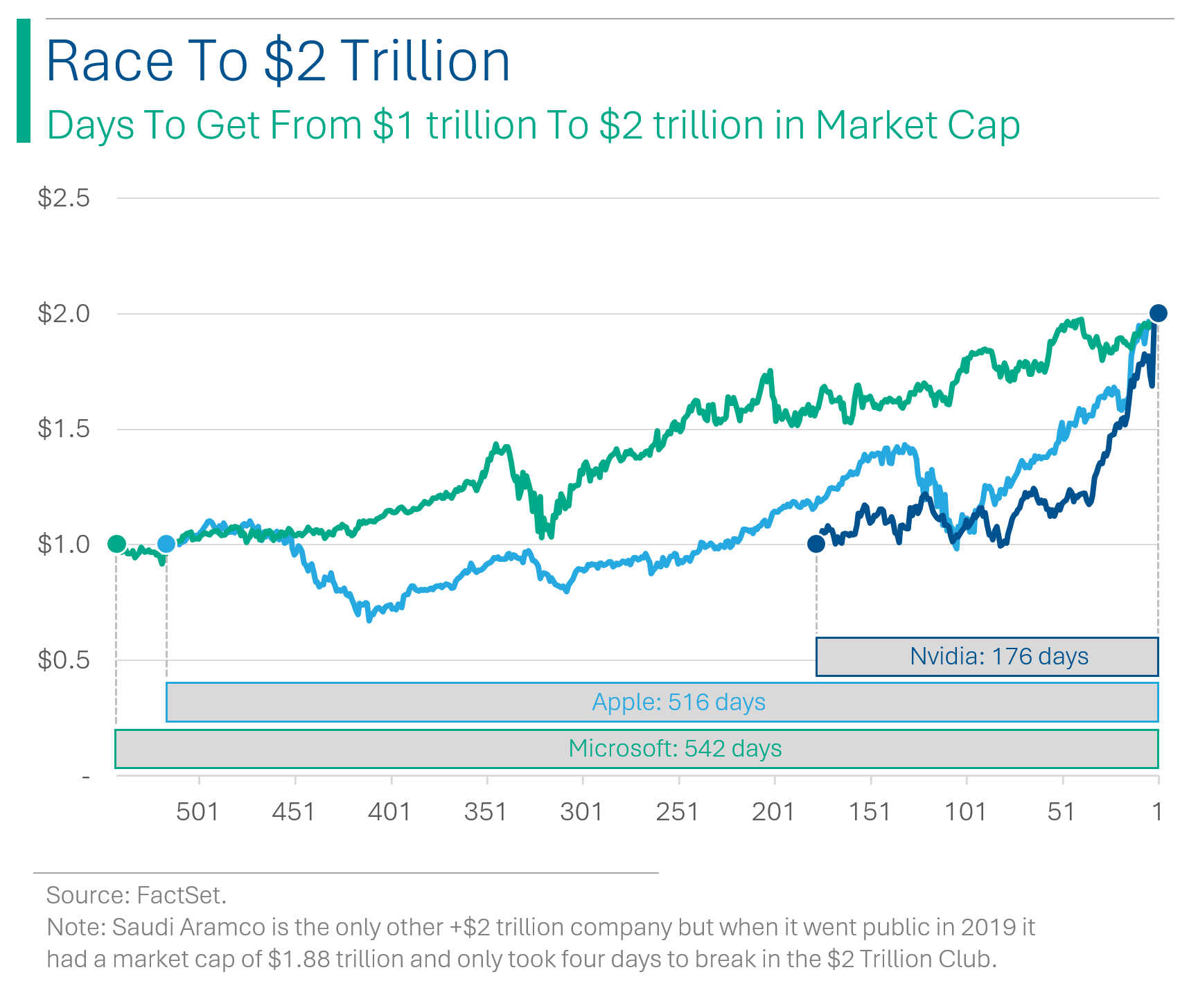 In December 2019, Saudi Arabia’s mostly state-owned oil giant, Saudi Aramco, became the first company to reach a market capitalization of USD$2 trillion. Given that it had just IPO’d four days earlier at a valuation of $1.88 trillion, it wasn’t really much of a run-up. The next ones to do it, however, took a lot longer. Both Apple and Microsoft took 2+ years to get to the next bracket of the Four Comma Club. That’s why when Nvidia breached this level during intraday trading on Friday (though it didn’t close above $2 trillion) it was extra impressive, as this feat only took a total of 176 trading days.
