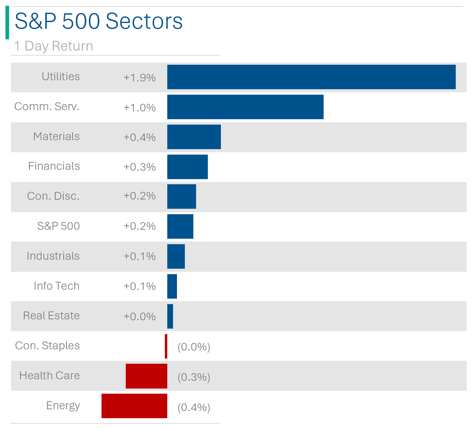 8 of 11 sectors closed in the green, led by Utilities (+1.9%) and Comm. Services (+1.0%), while Energy was lowest (again), down -0.4%.