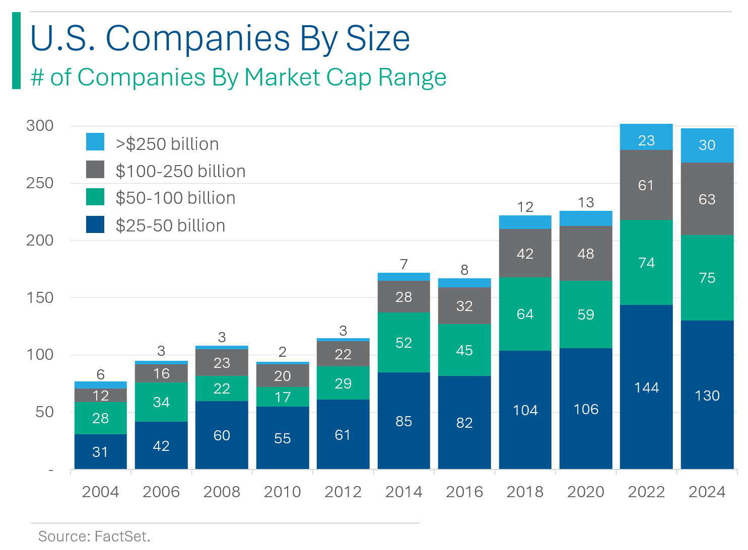 The last 20 years has seen the rise of jumbo corporations in the US. In 2004 there were only 18 companies with market capitalizations greater than $100 billion. Now that number is 93. Even companies on the ‘lower-end’ of large-cap ($25-50 billion) has seen 425% growth over this period.