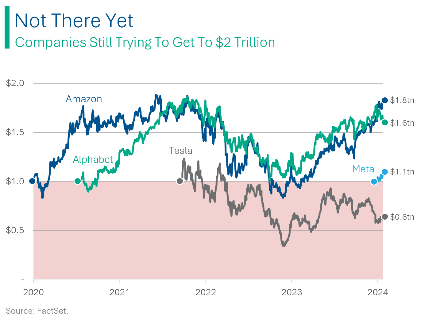 During the time it took Nvidia to secure its place as the fourth company to ever hit $2 trilly, three other companies have been trying to make it to the next threshold: Amazon, Alphabet and Tesla. The first two are nearly there, while Tesla has been on a pretty steady march backwards. Meta - the eighth company to cross $1T - just did it last month.