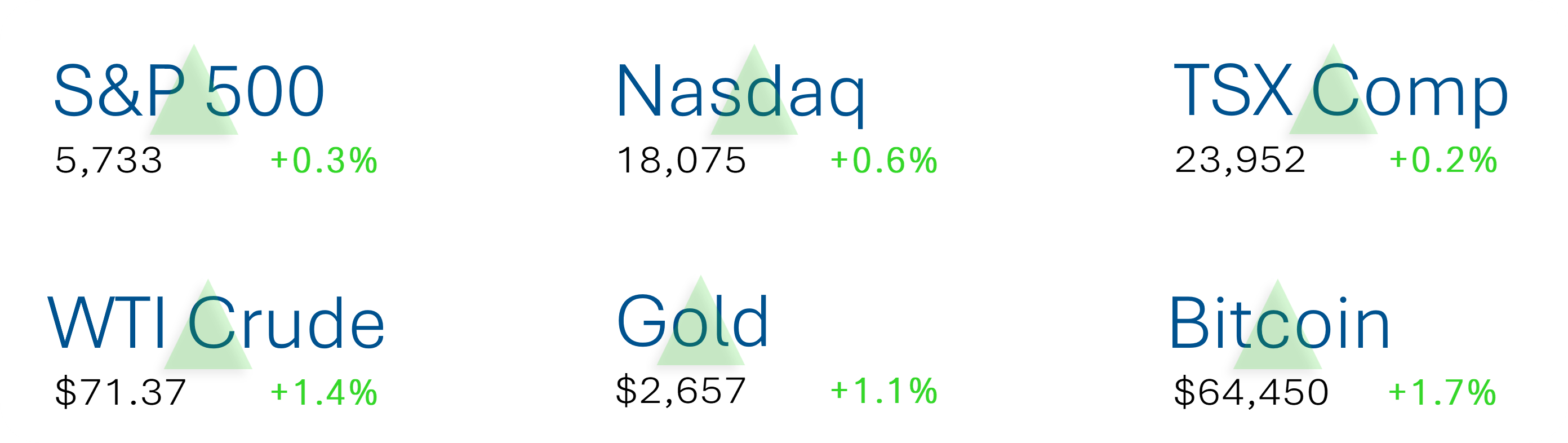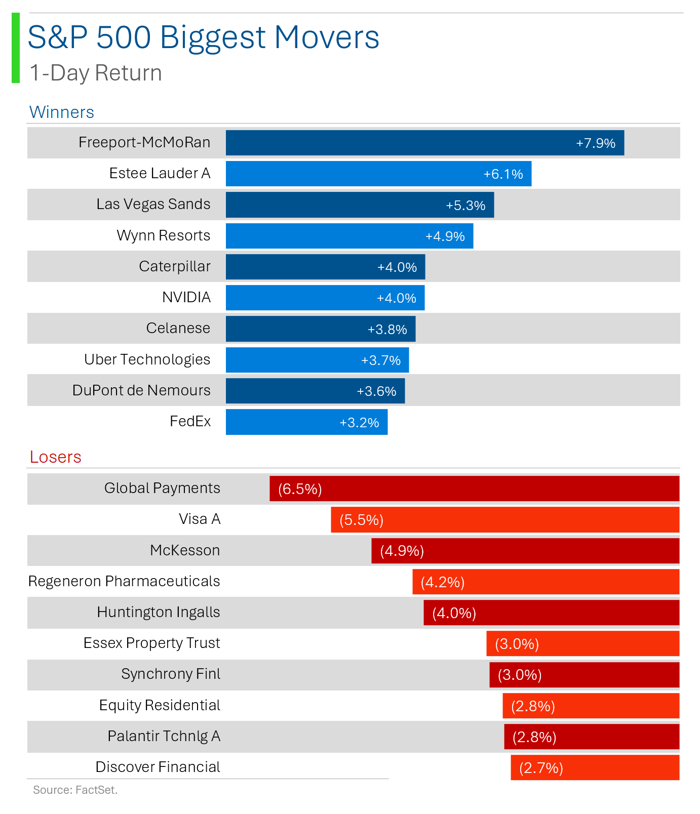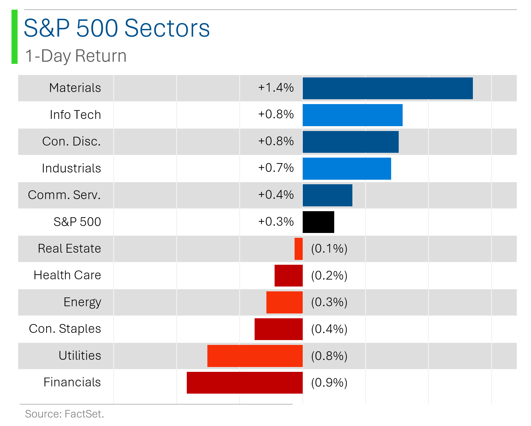 U.S. equities closed higher with record-setting performances from the Dow and S&P. Chemicals, industrial metals, and machinery led the way due to China's stimulus efforts, while credit card companies like Visa and regional banks underperformed due to regulatory concerns.