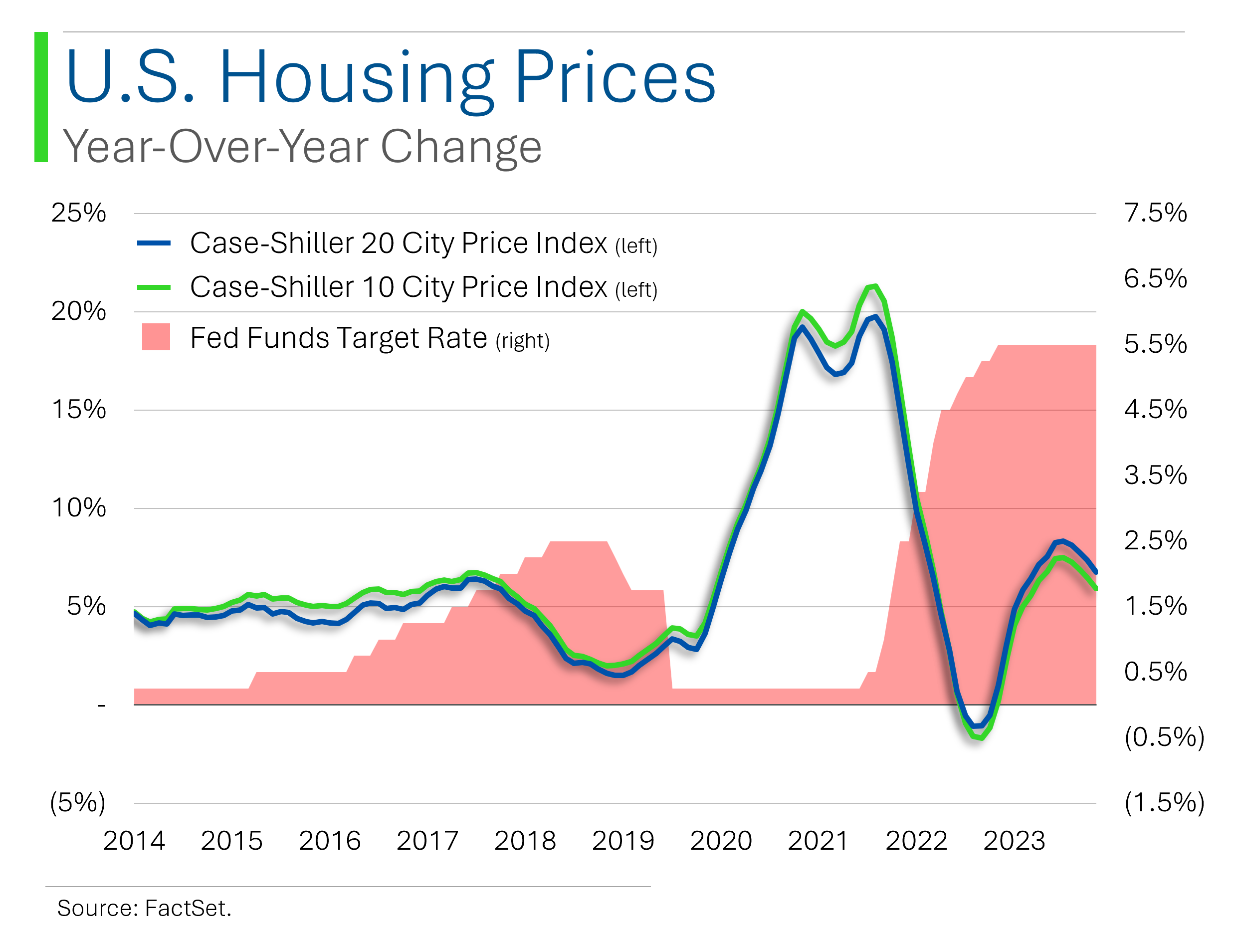 The real bridge between Interest Rates and Housing Prices is mortgage rates, which have followed a similar trajectory to the Fed Fund rates.