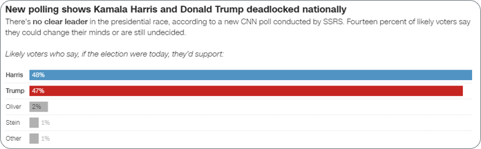Reuters / Harris at 48%, Trump at 47% in the latest CNN/SSRS poll. The poll was conducted between September 19-22, surveyed 2,074 registered voters and has a margin of error of 3 percentage points.