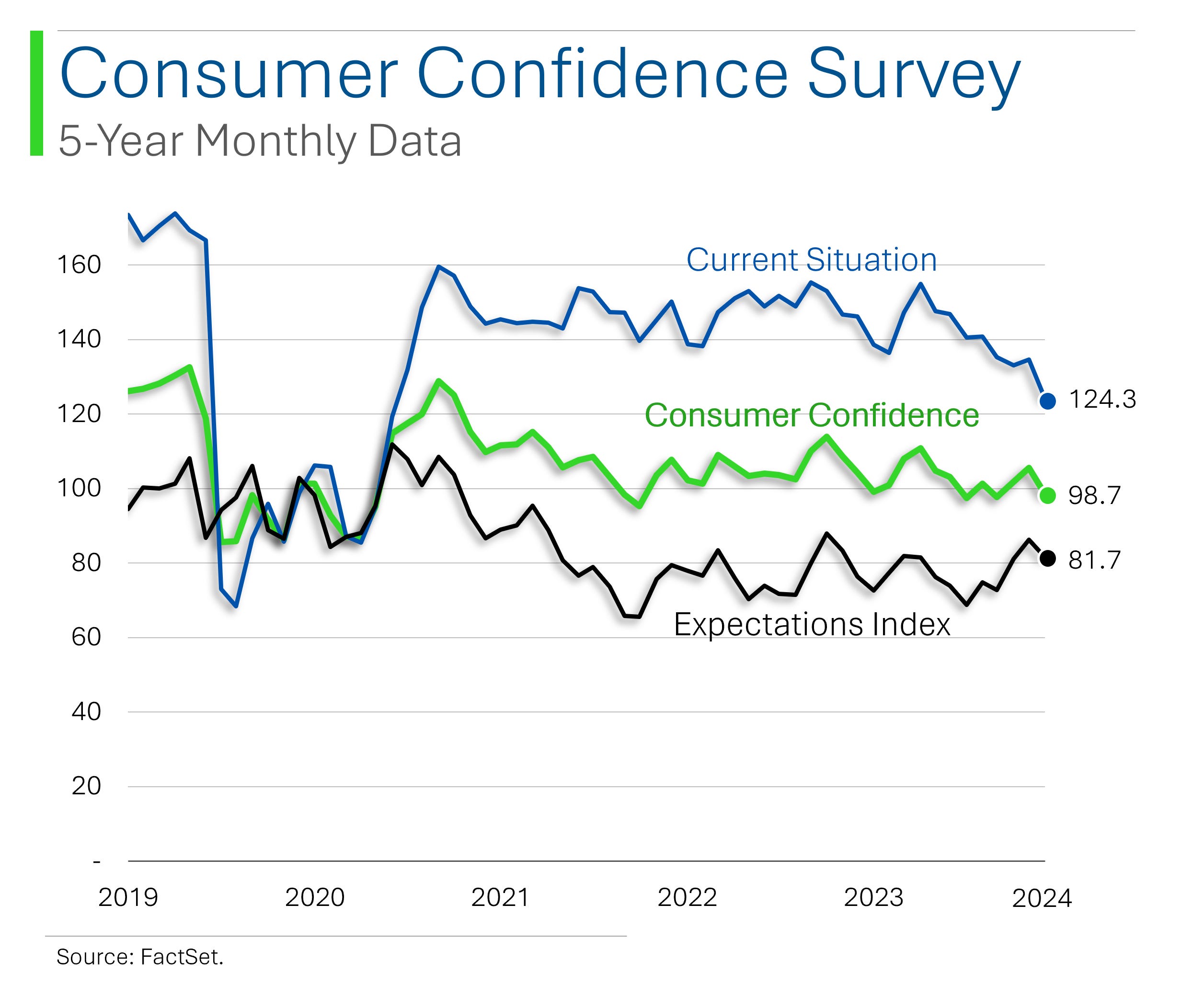 Consumer Confidence took a significant hit in September, with the index dropping from 105.6 in August to 98.7, well below economists’ expectations of 104, as concerns over the economy's direction weighed heavily on Americans' minds.