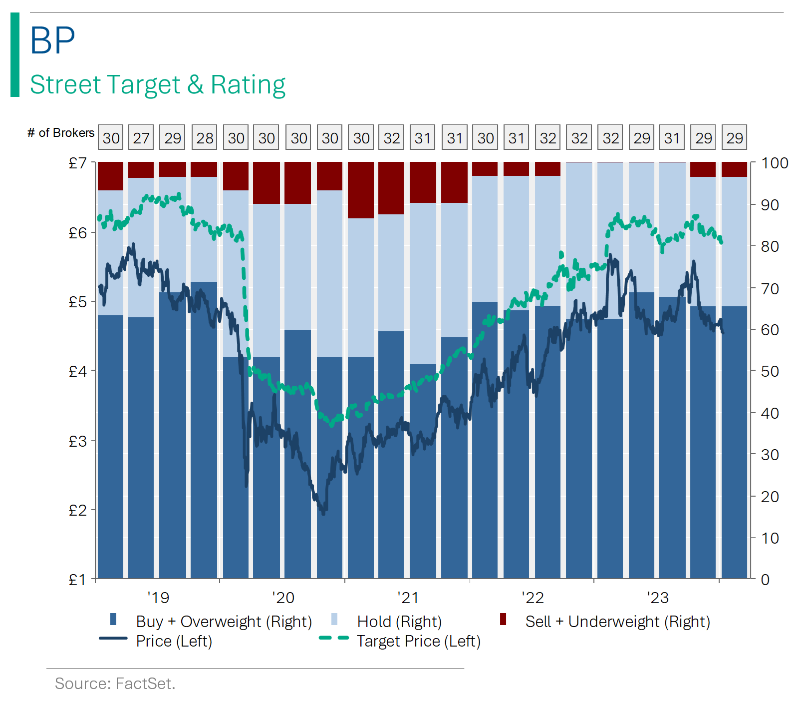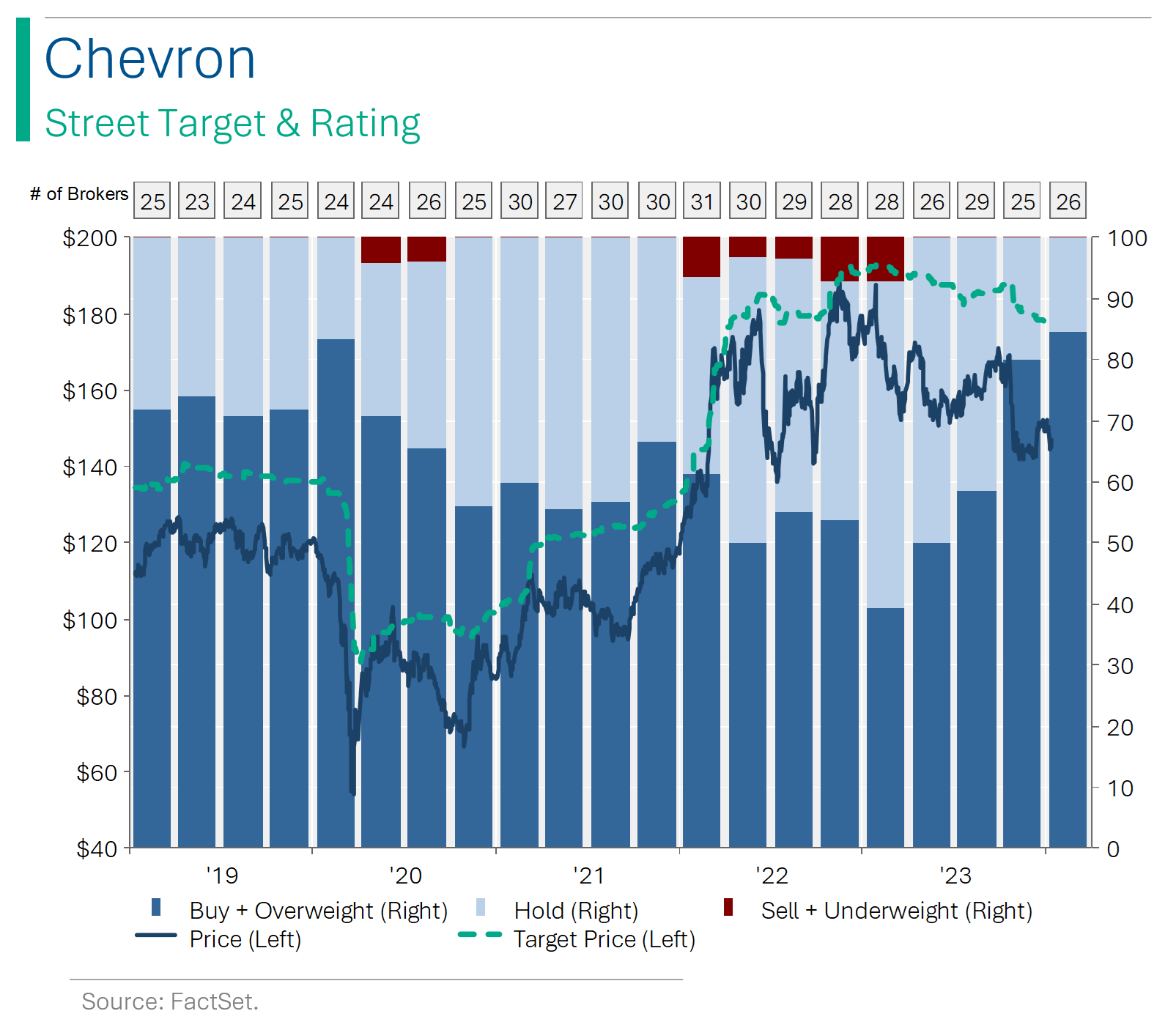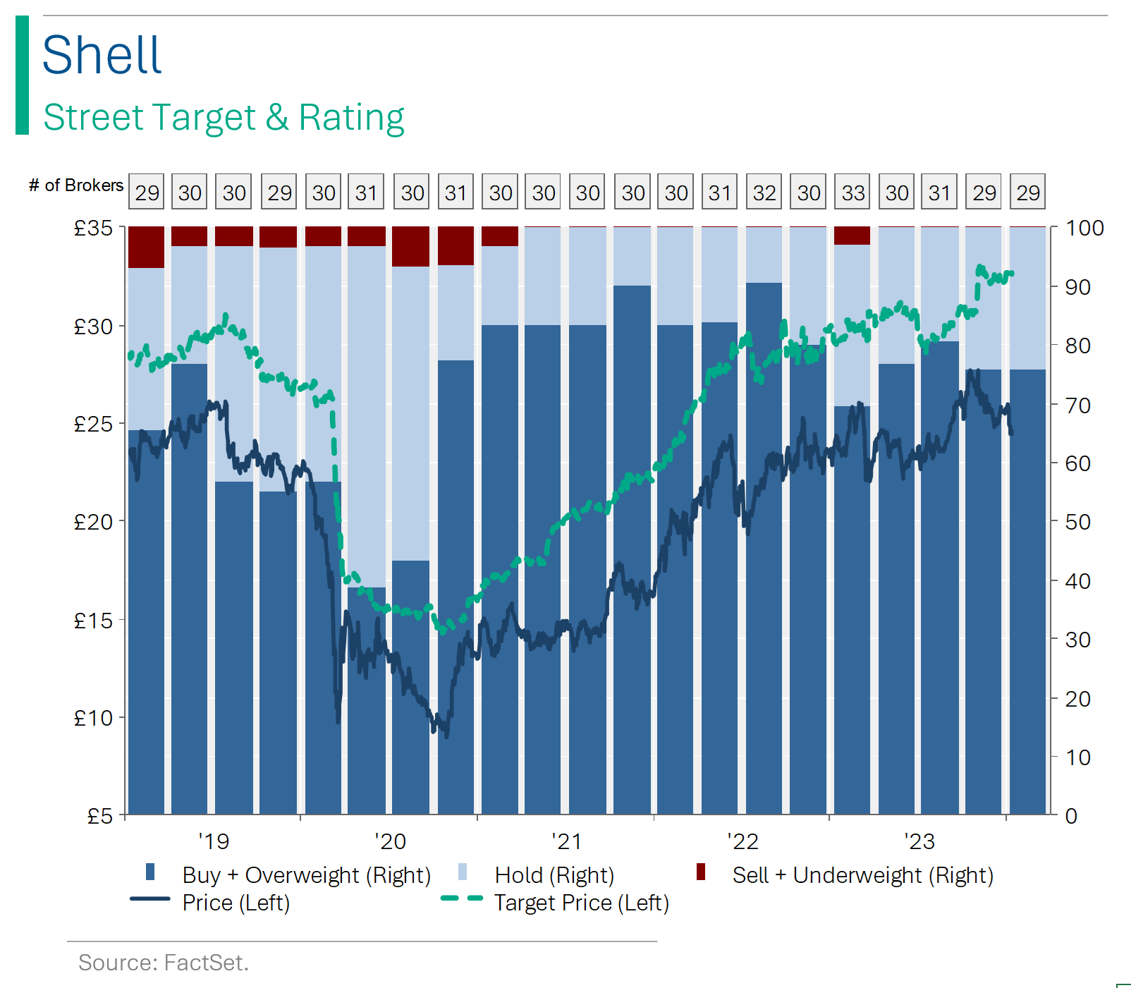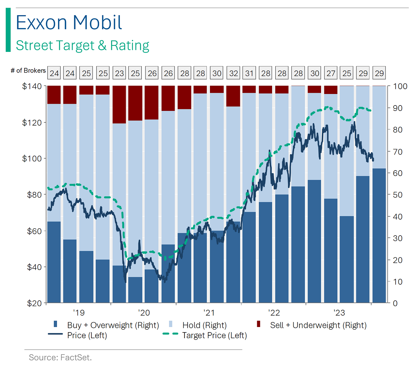 From an equity investing perspective, I’ve never been a big fan of oil companies outside of being a short-term way to play the oil price. However, for those more open minded, the Majors do pay fairly healthy dividends (range from 3.8% yield for Exxon to 4.8% for BP). And for what it’s worth, the Street is still pretty positive on them (see below).