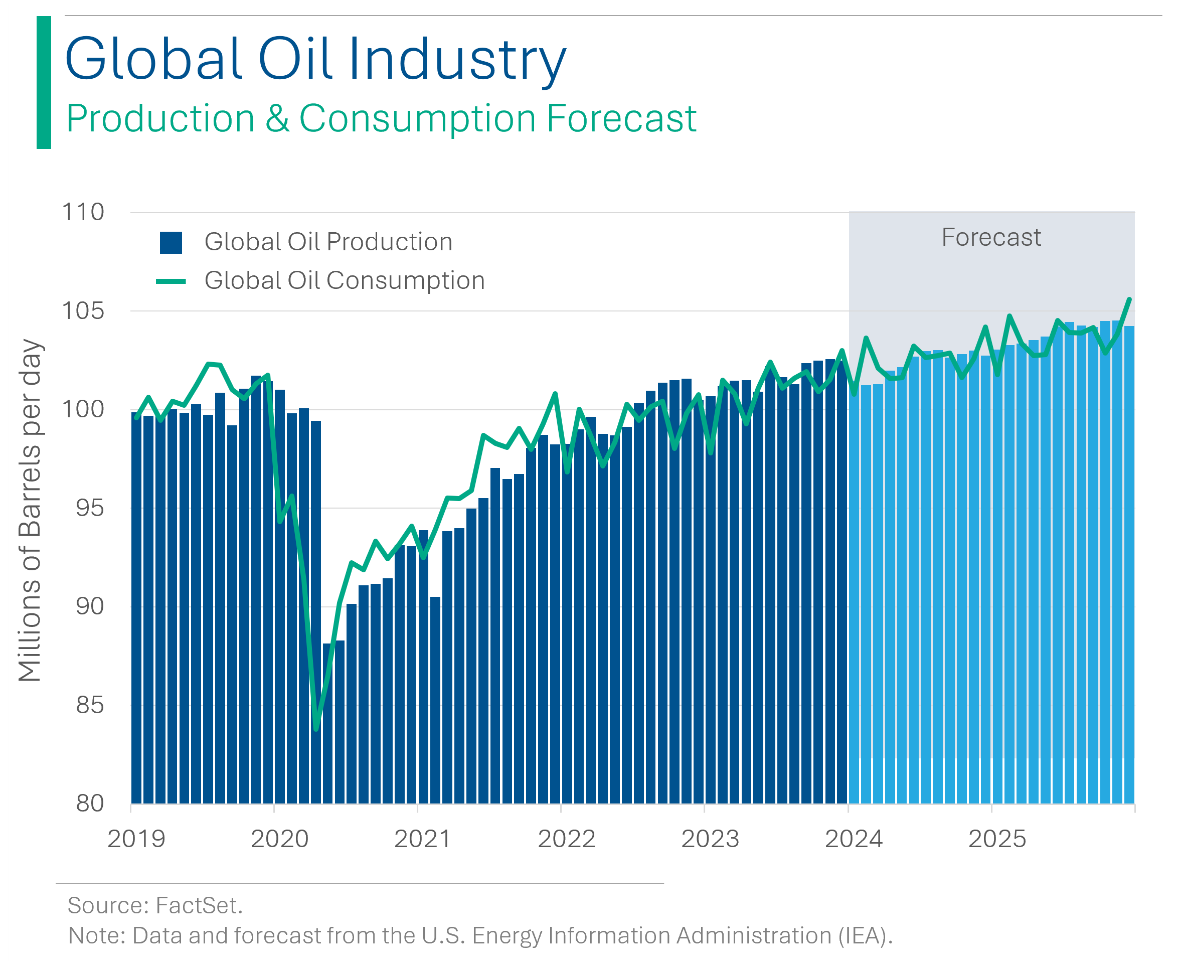From a supply and demand perspective, the U.S. Energy Information Administration (IEA), forecasts modest +1-2% consumption growth over the next few years, which is slow enough that if all goes to plan, we shouldn’t be expecting anything dramatic to happen with the oil price given the vast amount of idle capacity sitting in the wings. Basically, unless something big happens, like, a full-blown middle-east war, the energy space should (fingers crossed) be boring for the next little while. Which is great.