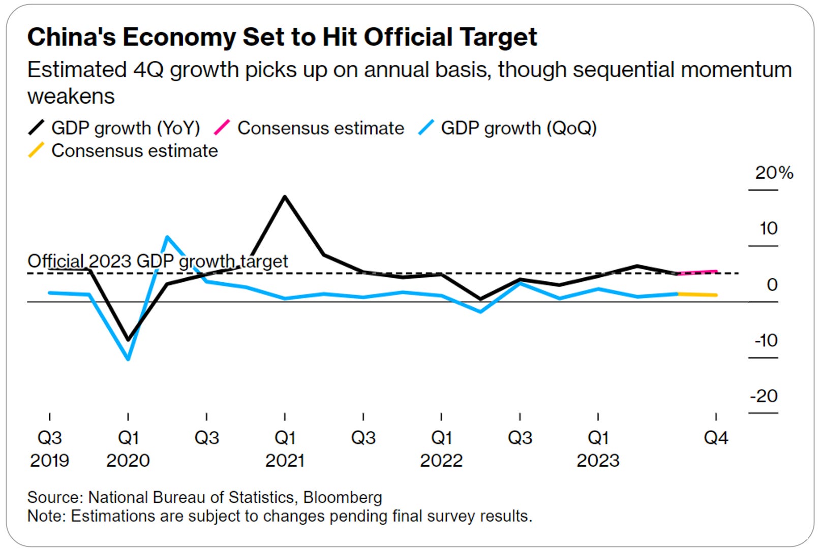 China is poised to release its final major economic data for 2023, with expected improvements in GDP, industrial production, and retail sales due to a low comparison base from pandemic restrictions. The country's GDP likely grew by 5.2% last year, aligning with government targets, but forecasts for 2024 suggest a slowdown to 4.5% growth without additional stimulus. Real estate challenges remain a significant threat to economic stability, with calls for decisive policy actions to stabilize the sector. (Bloomberg has the full story)