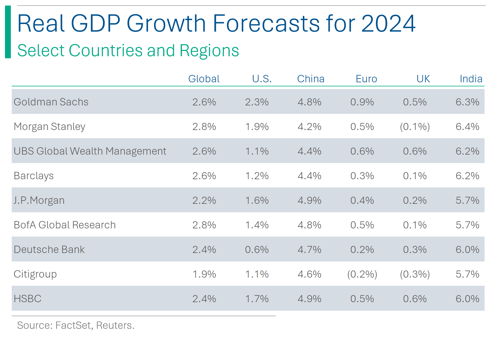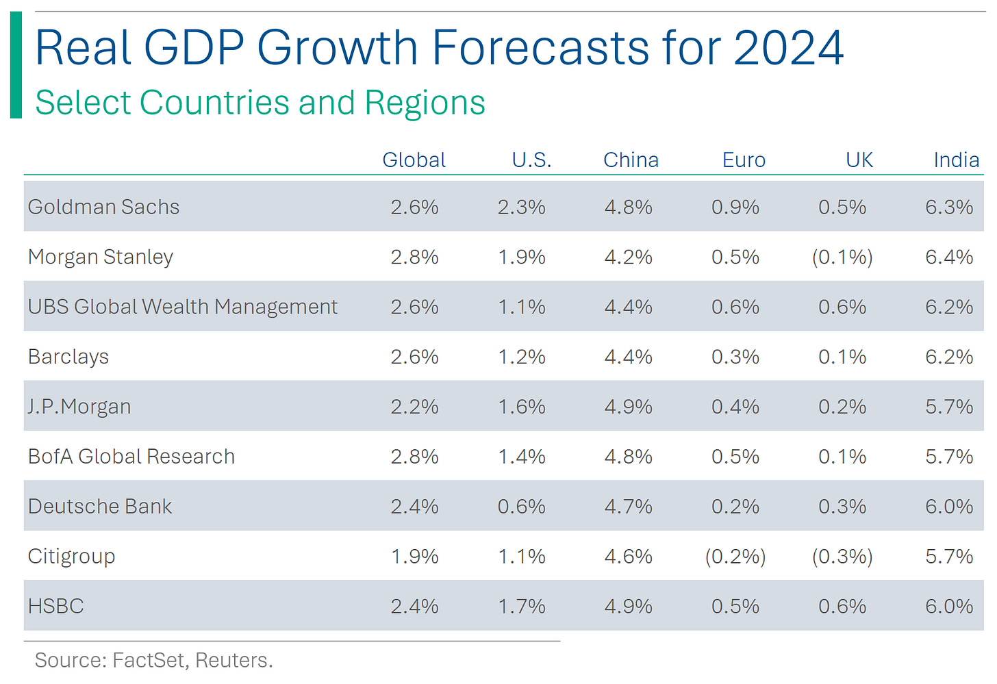 Reuters was nice enough to aggregate a pile of bank forecasts for GDP growth in 2024. US numbers are a far cry from most recent Q3 figure of +4.9% year-over-year (Q2 was +2.1%) but still consensus is that it will skip the recession everyone was forecasting this time last year. The outlook for Europe and UK looks a bit dicey (range -0.2% to +0.9% and -0.3% to +0.6%, respectively), while India continues to crush it as the new growth machine of Asia. (Link to the article)