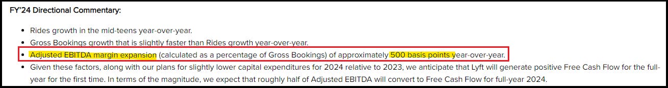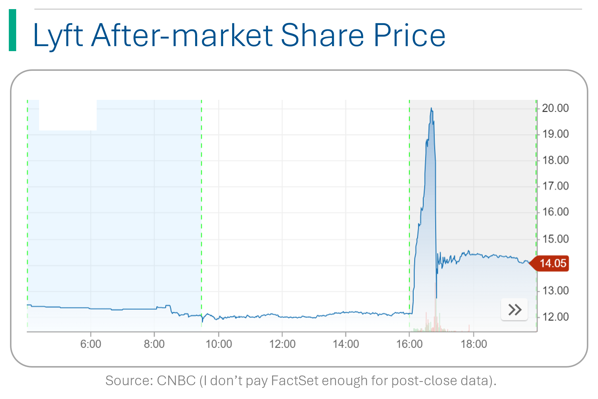Lyft reported a solid quarter after the close yesterday but not enough to warrant a ~+60% pop in the shares. That’s when management realized they had a bit of a typo in their market release: See they meant to forecasts a 50 basis points (50%) in Gross Bookings - which is great, but a far cry from the 500 basis points (500%) one that made it into the presser.
