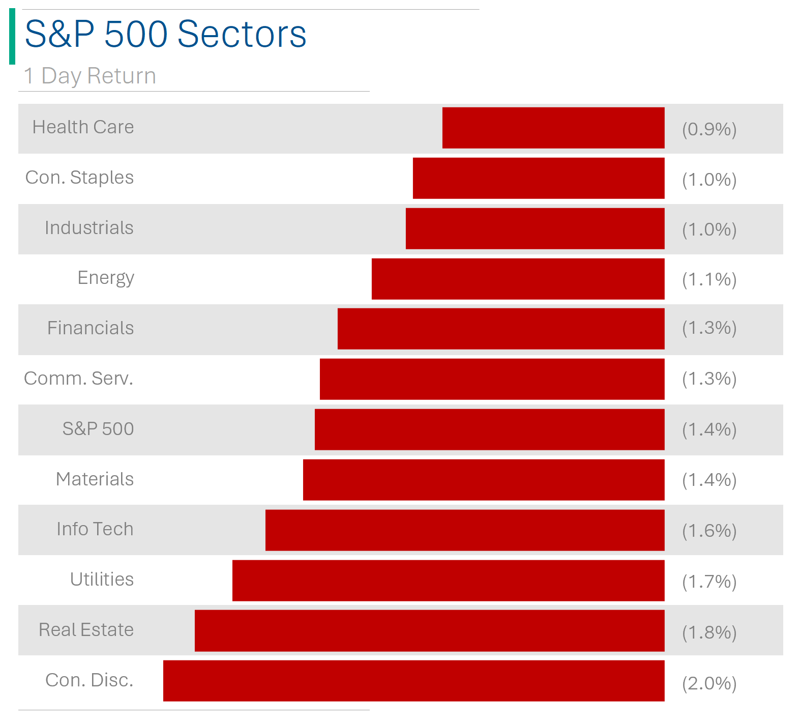 None of the 11 sectors close in the green, with defensive Health Care (-0.9%) and Consumer Staples (-1.0%) doing the best. Consumer Discretionary (-2.0%) and Real Estate (-1.8%) were the worst.