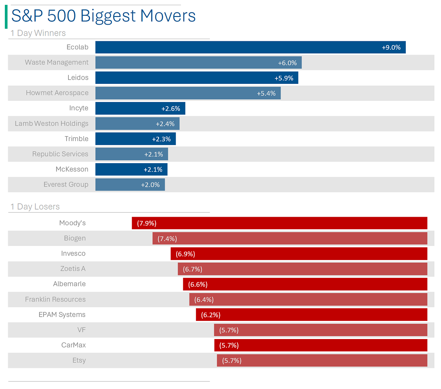 Ecolab (ECL) [+9%]: Q4 EPS and revenue match expectations with organic sales up 6%. Q1 and FY24 EPS guidance exceeds consensus, predicting margin expansion amid easing inflation.