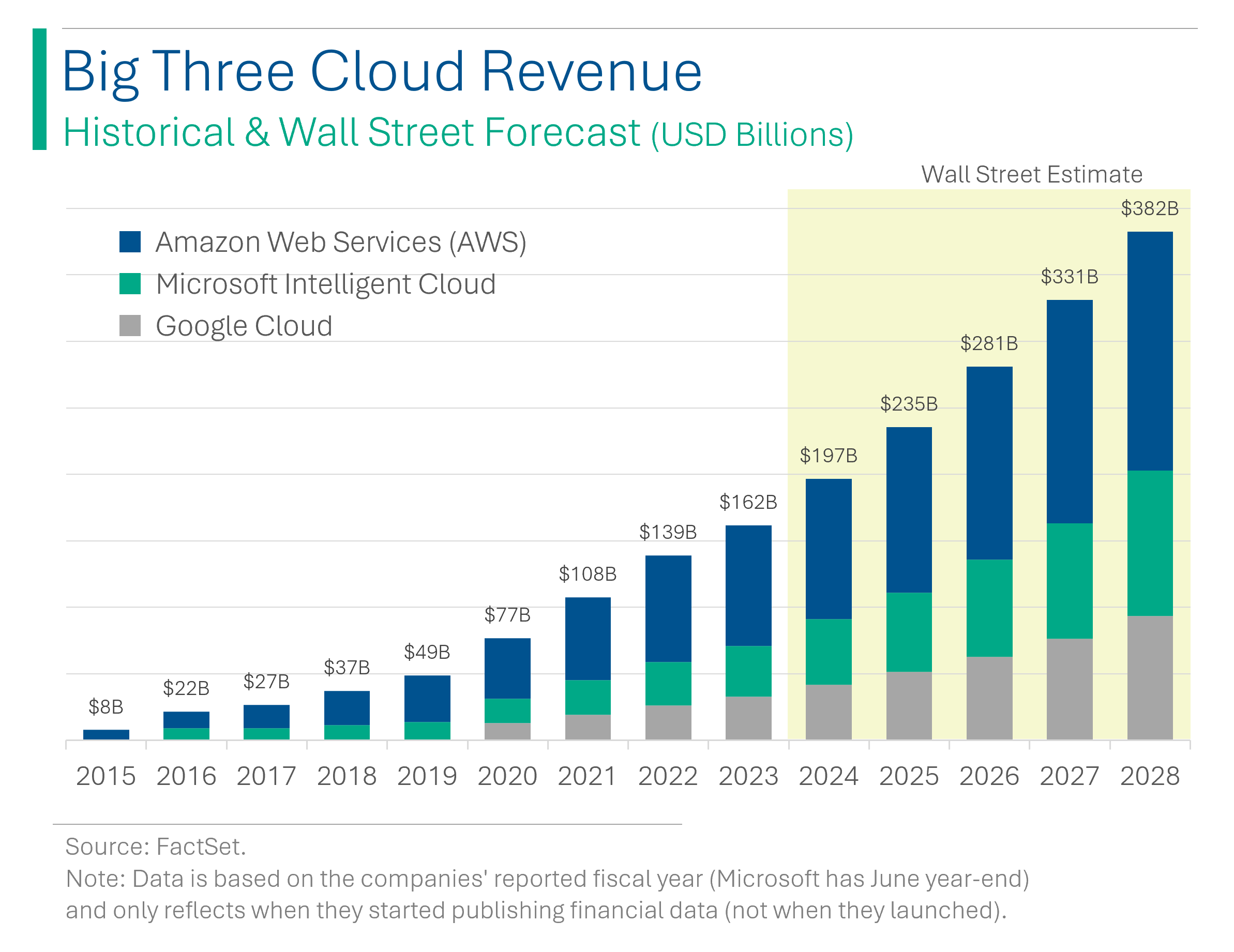 Combined, the three cloud divisions finished 2023 with a total of $162 billion in revenue. The Street expects this figure to strike $380 billion by 2028, making it one of the largest single industries in the world.