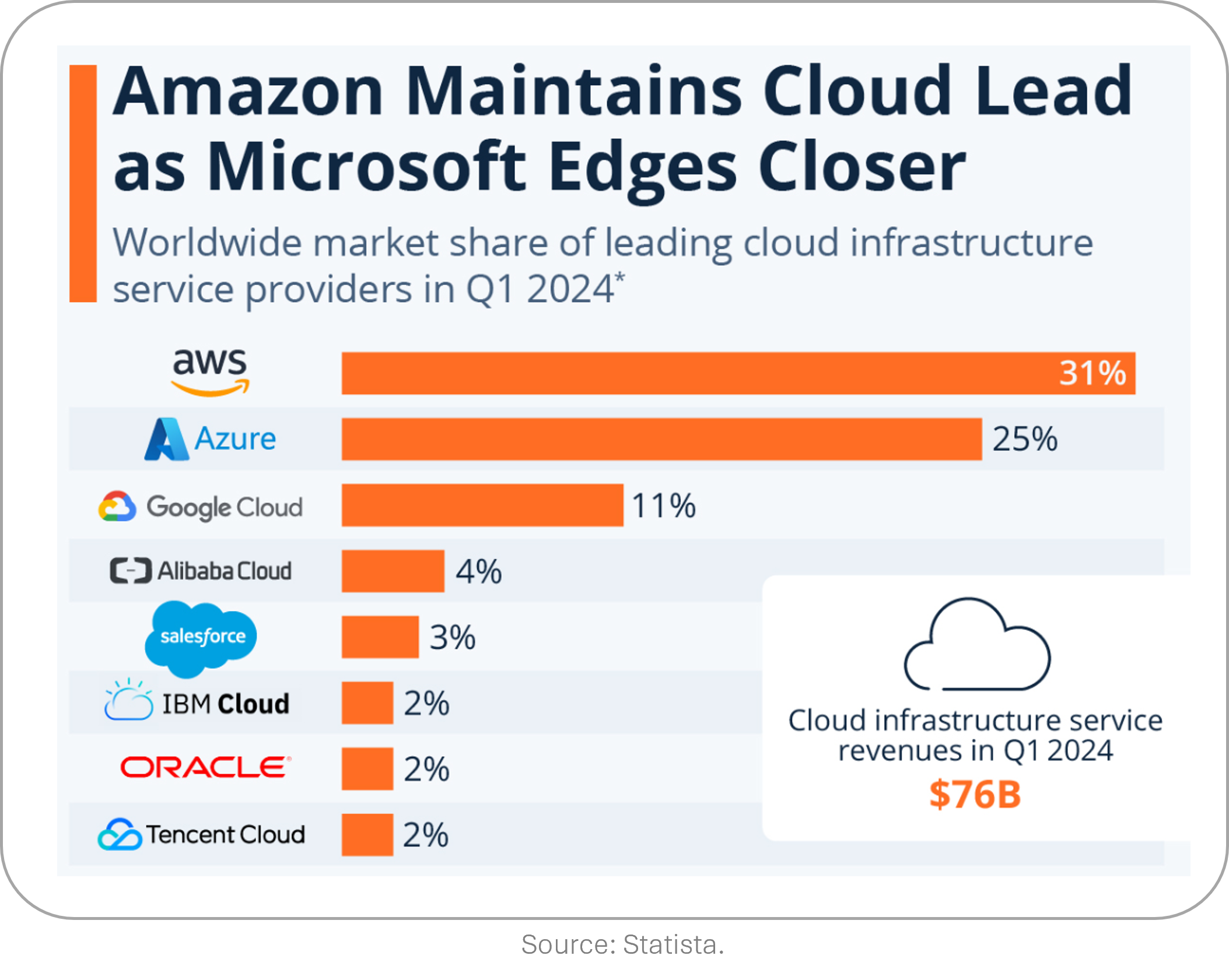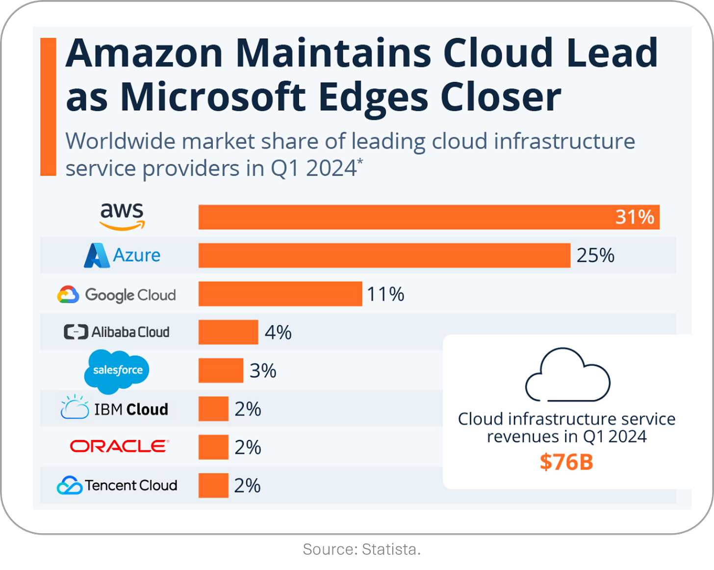 Amazon’s Amazon Web Services (AWS), Microsoft’s Intelligent Cloud (including Azure), and Alphabet’s Google Cloud currently hold about 2/3rds market share in the cloud infrastructure market. And that’s probably not changing anytime soon.