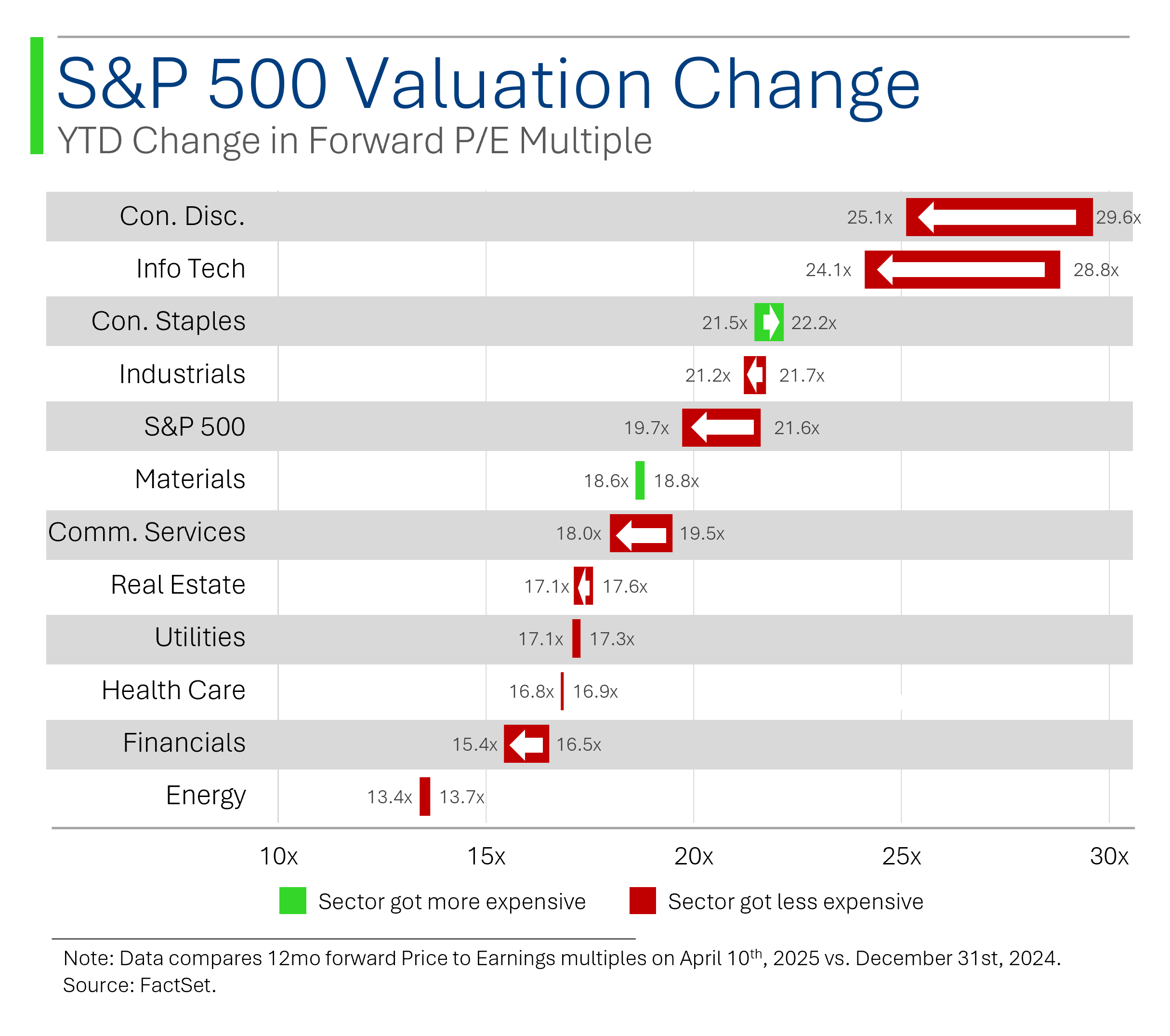 While Tech may have been hit hardest, every sector in the S&P 500 has seen their one year forward P/E multiples compress, save for defensive Consumer Staples and… Materials (?) Didn’t see that one coming did ya!