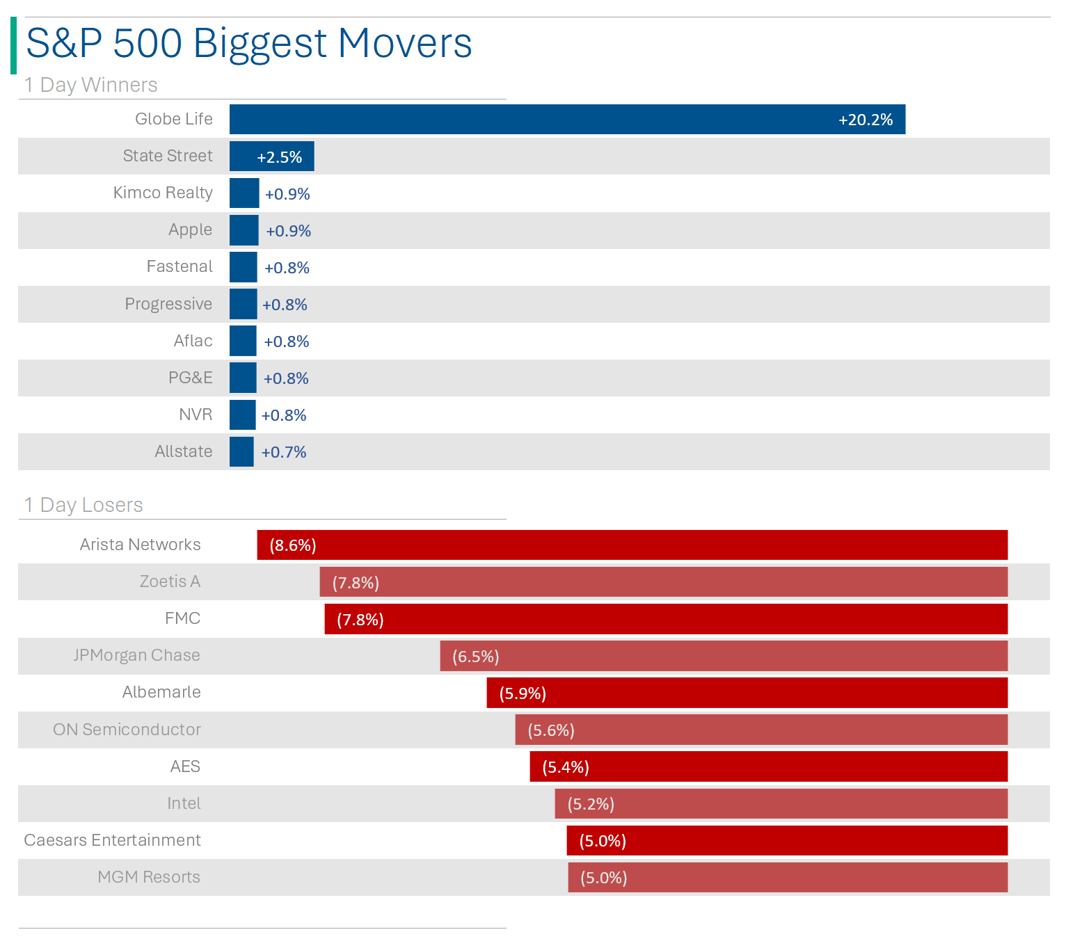 Globe Life (GL) [+20.2%]: Post-close Thursday, issued a statement addressing a short report from Fuzzy Panda Research as self-serving and "wildly misleading." The stock fell ~53% a day earlier following allegations of insurance fraud and executive misconduct.