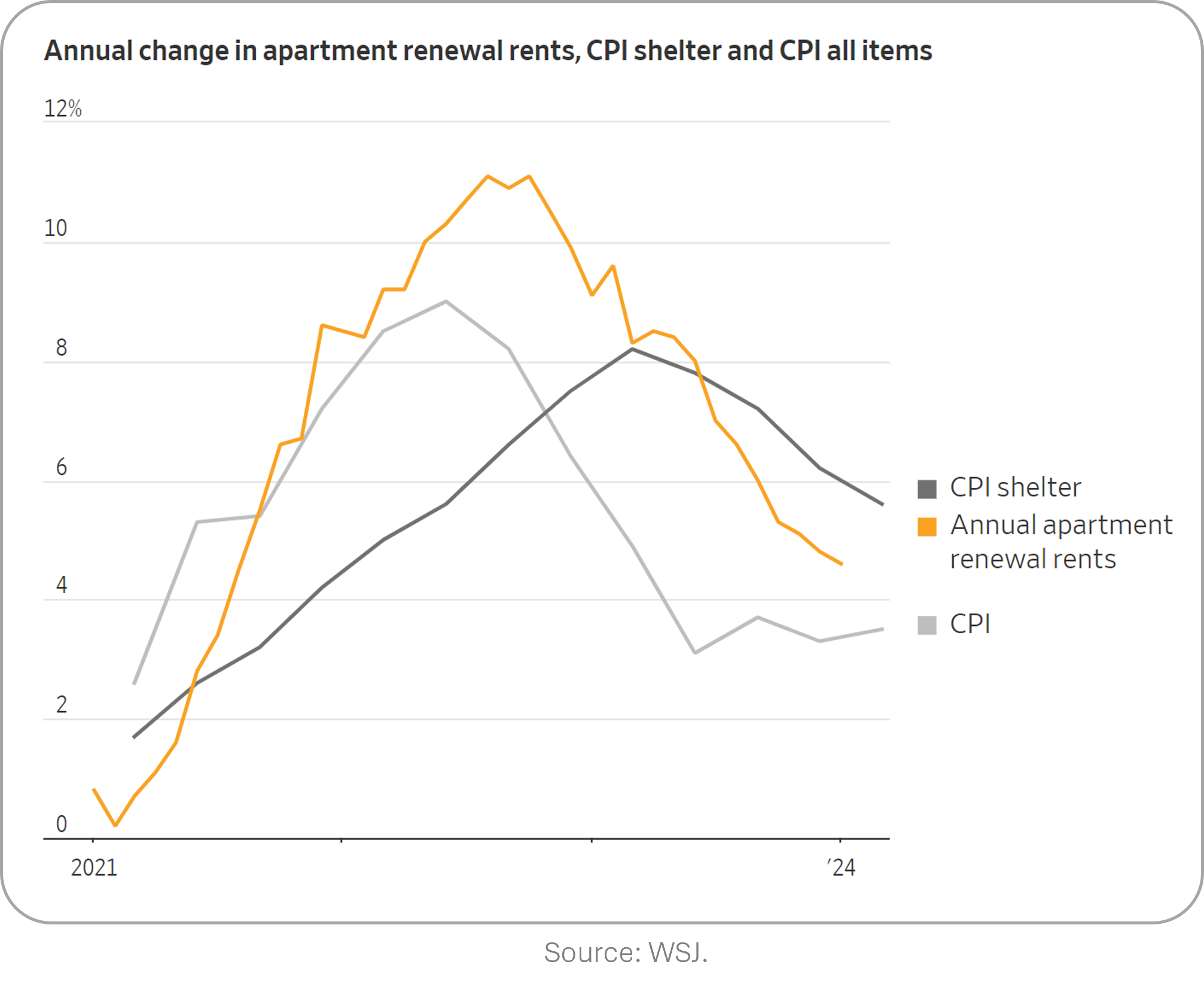 WSJ / Rents are still rising and pumping up inflation. Despite cooling off from double digit levels, the shelter component of CPI was up 5.7% YoY in March.