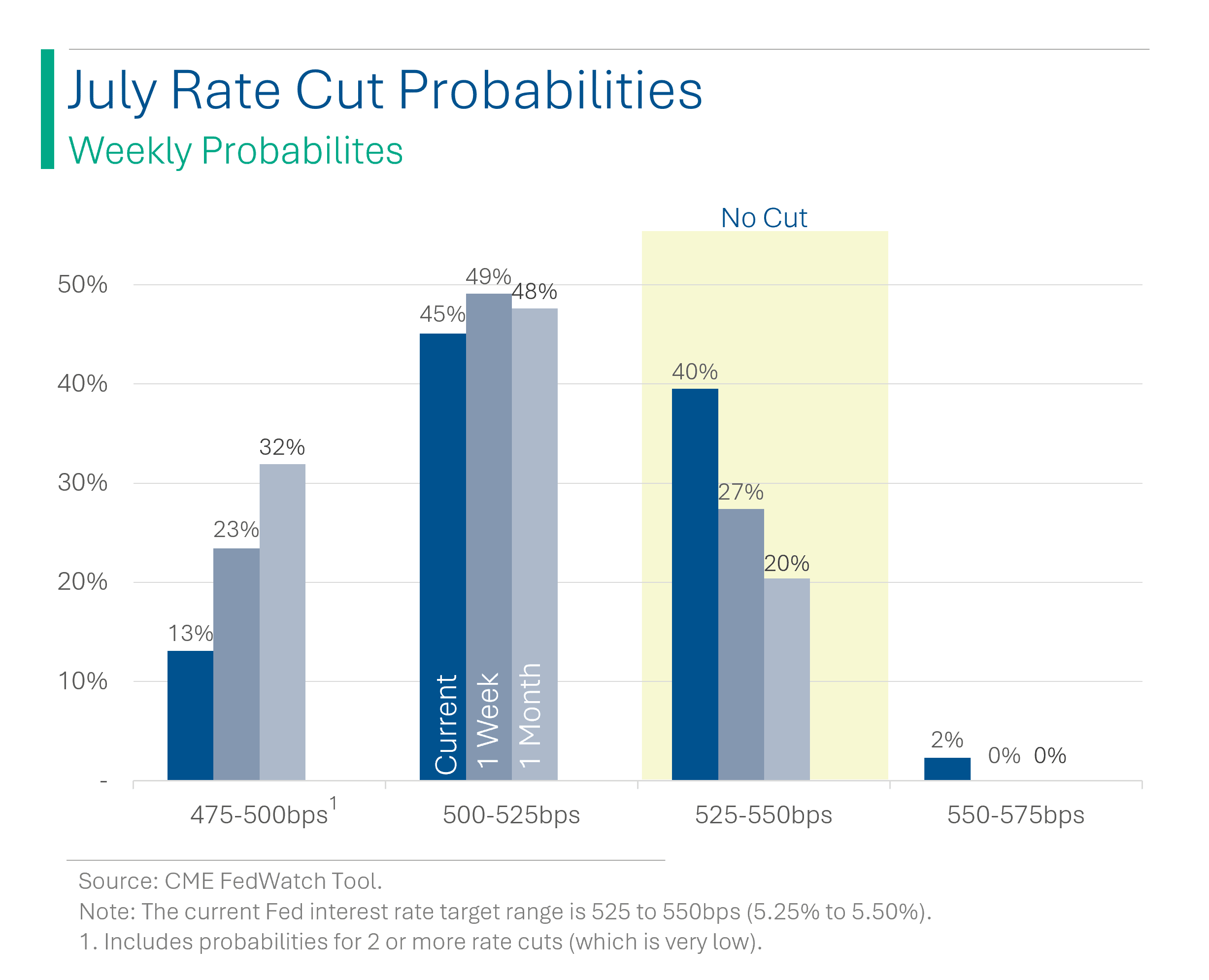 Lastly, the big story of the week was CPI inflation coming in hot for the third month in a row. The odds of one or more rates cuts by the July Fed meeting now sits at just 58% and, for the first time this year, odds of a potential rate increase are now starting to be priced in.