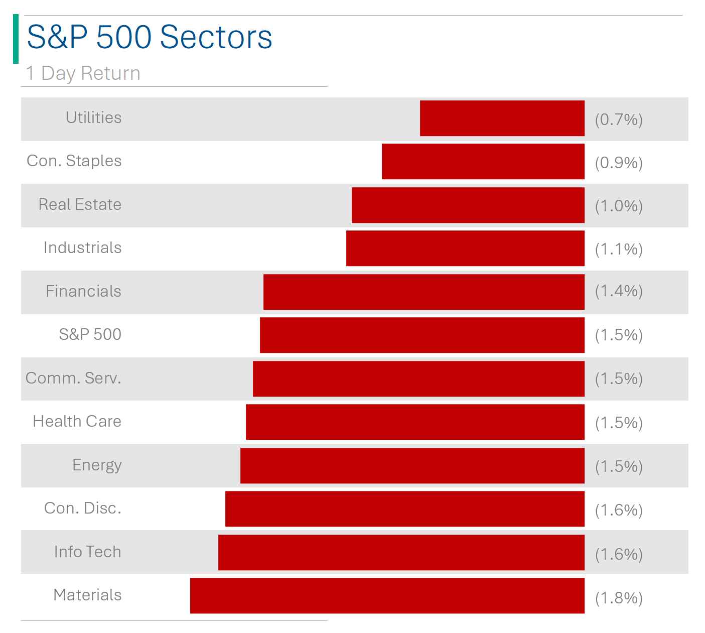 None of the 11 eleven sectors closed higher Friday or for the week. Tech did the best, finishing the week down -0.2%. Financials finished the week -3.6%, the worst of its peers.