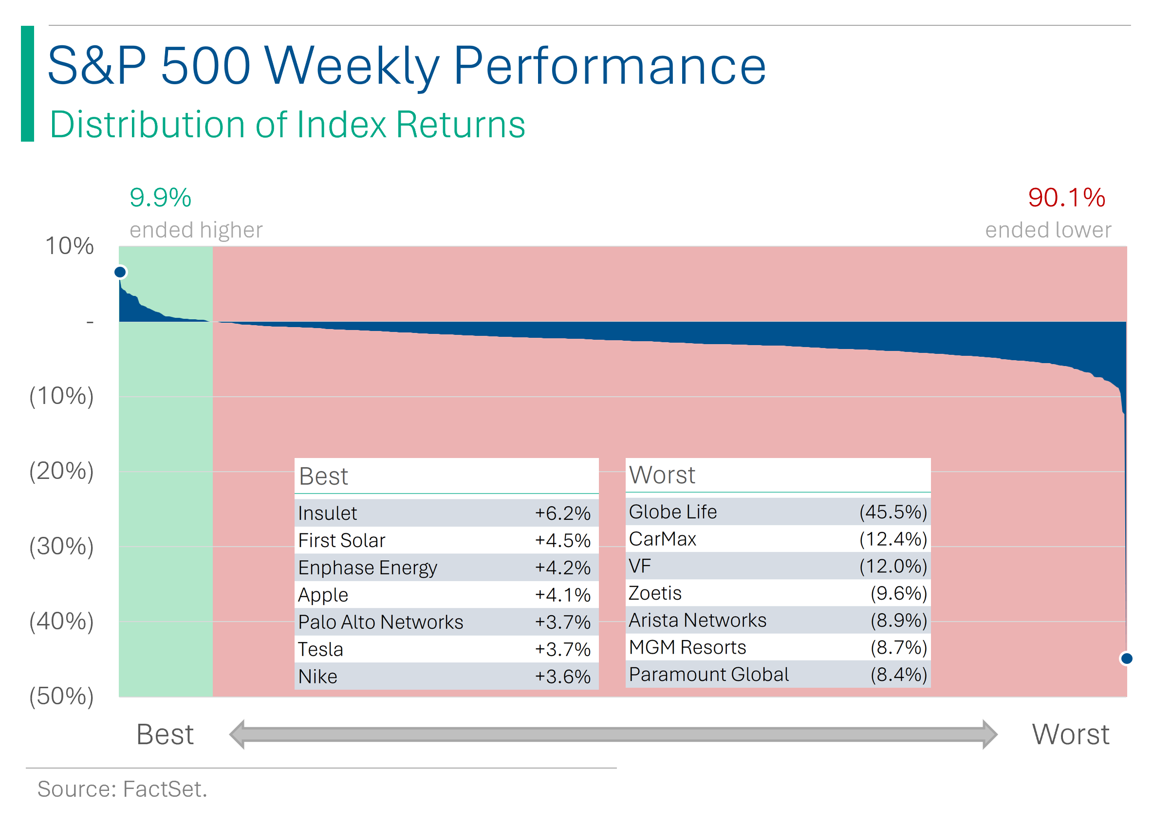 While the moves upward were due to a few strong performers, the move downwards this week has been pretty broad-based. In fact, the few bright spots in the market this week (Tesla, Nike, Apple) were more akin to relief rallies, as all those stocks have been crushed this year.