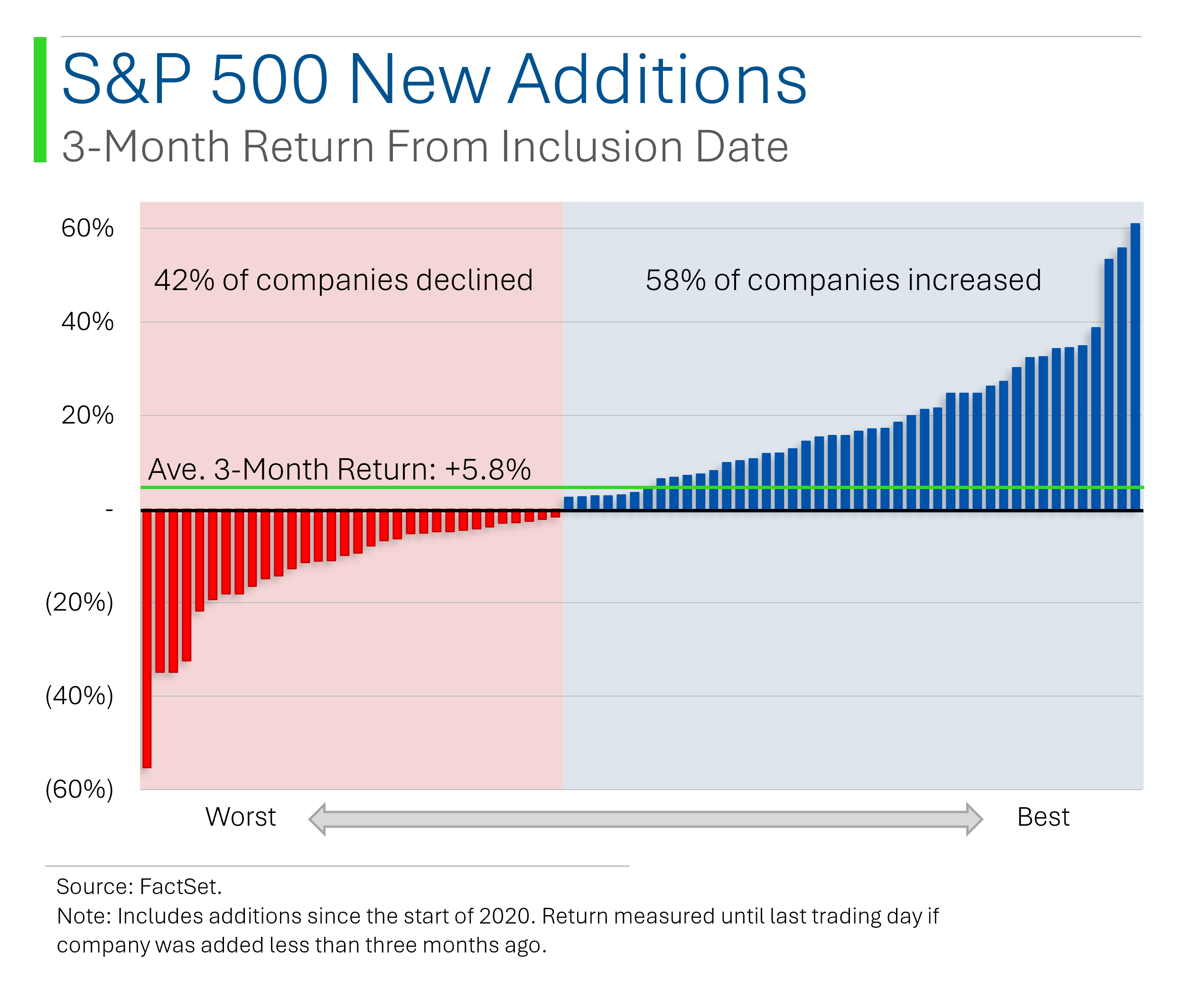 As you can see below, companies that were added to the S&P since 2020 posted an average gain of +5.8% in the first three months of being listed in the index. That’s actually pretty huge.