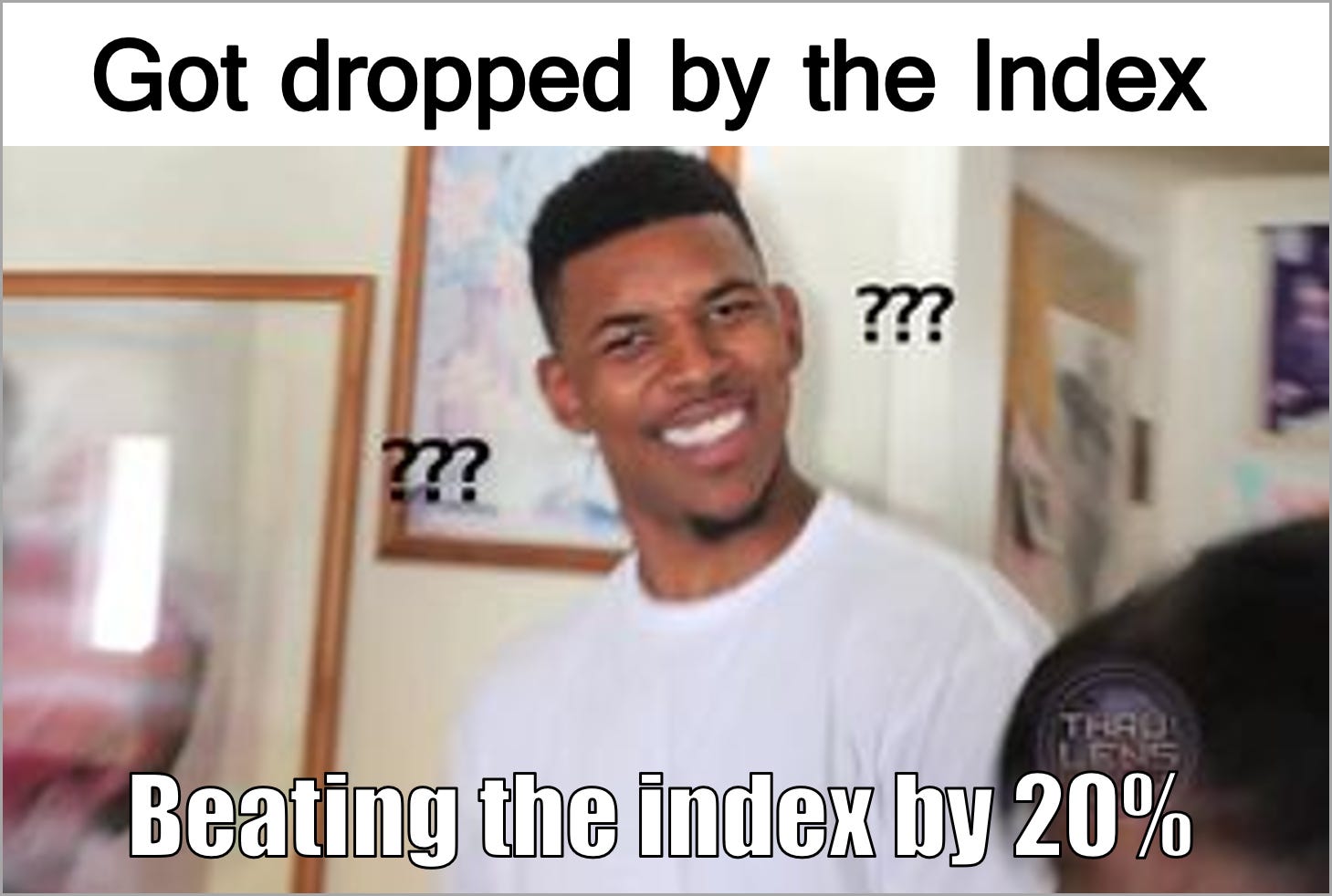 Now there’s actually some decent logic to why a company can outperform in the period following their deletion. Investors are given a heads-up about companies being removed from the the index and there is often a bit of a fire sale ahead of the de-indexing event.