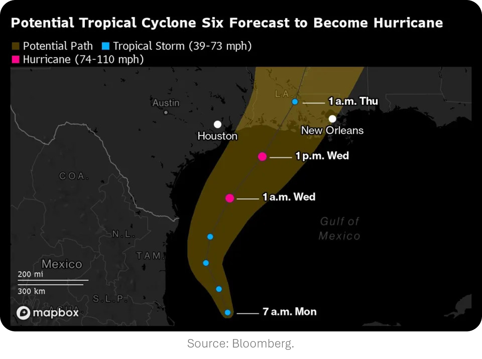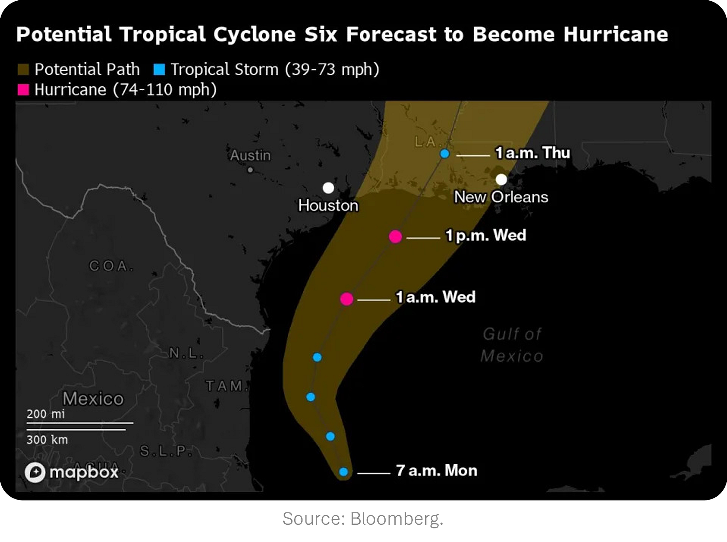 Yahoo Finance / Tropical storm Francine strengthens, spurring oil shutdowns. With 60 mph winds, oil giants like Chevron, ExxonMobil, and Shell have evacuated crews and shut down offshore production. The storm’s projected path intersects fields producing 125jk barrels of crude and 300 million cubic feet of natural gas daily. While damage to overall output is expected to be minimal, Francine could hit the Gulf Coast as a Category 1 hurricane by Wednesday, bringing storm surges up to 10 feet.