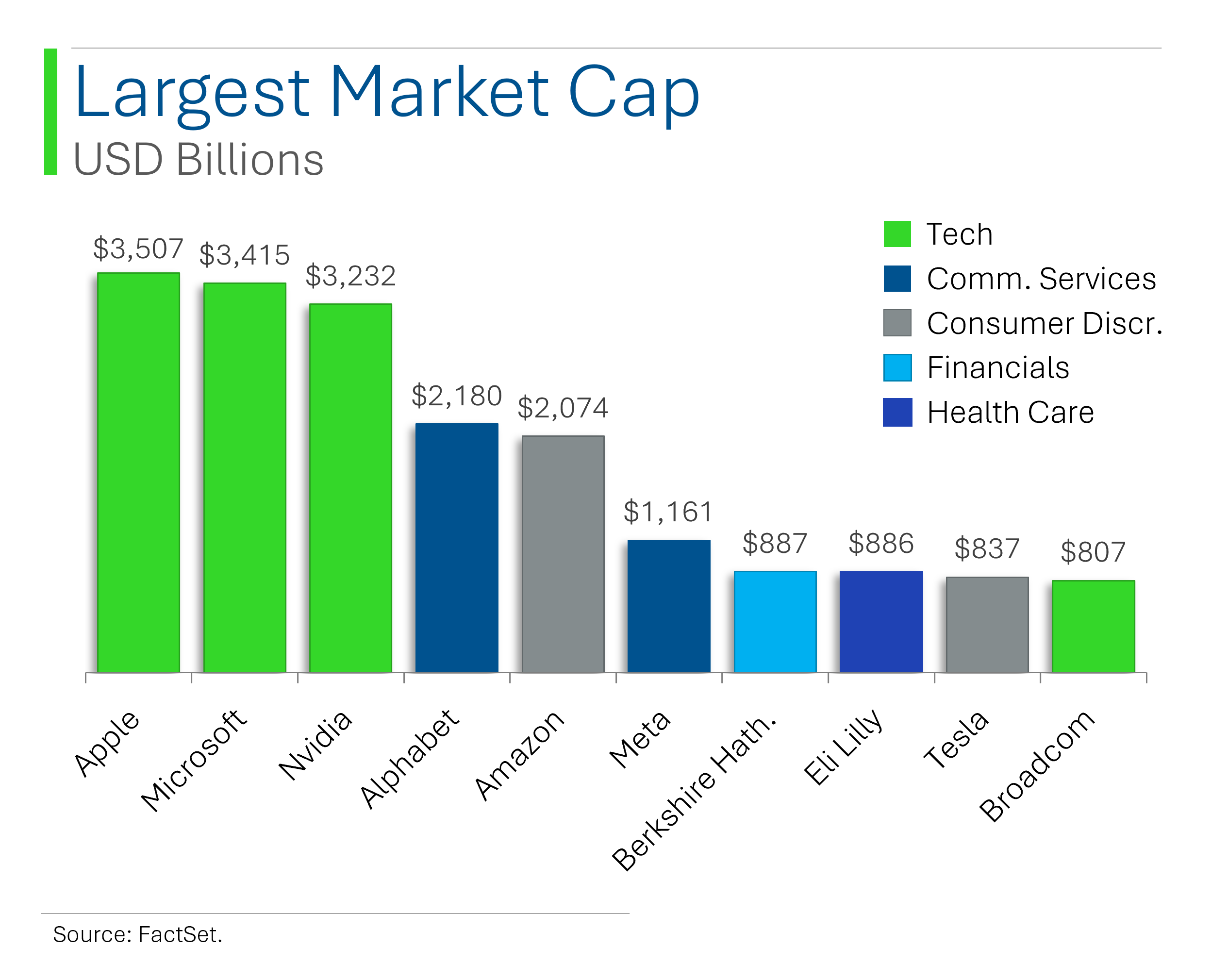 To start, I don’t think anyone would be too shocked by the list of companies with the largest market caps. The Top 10 is the Mag7 plus Berkshire Hathaway, Eli Lilly and Broadcom. Pretty much household names.