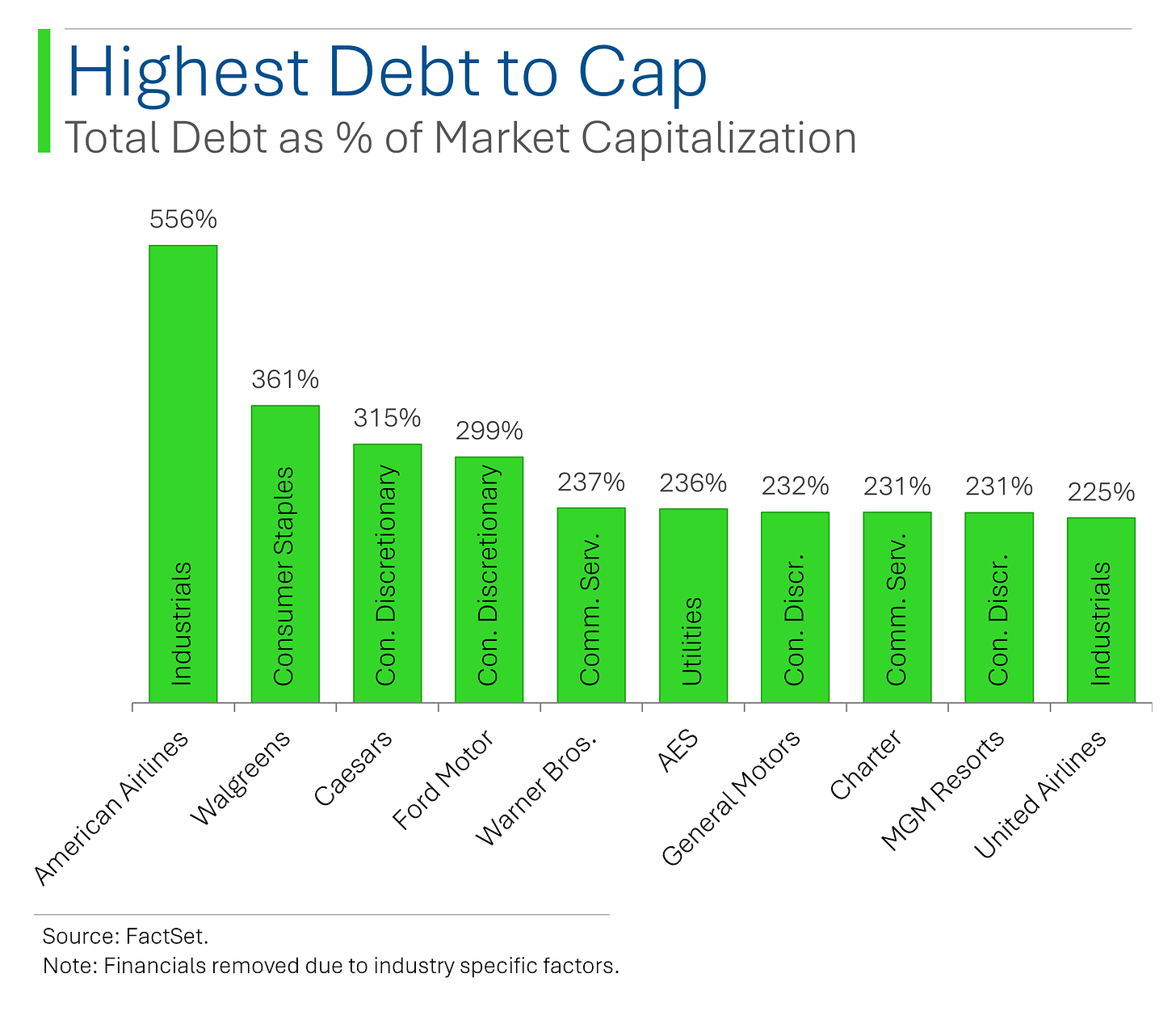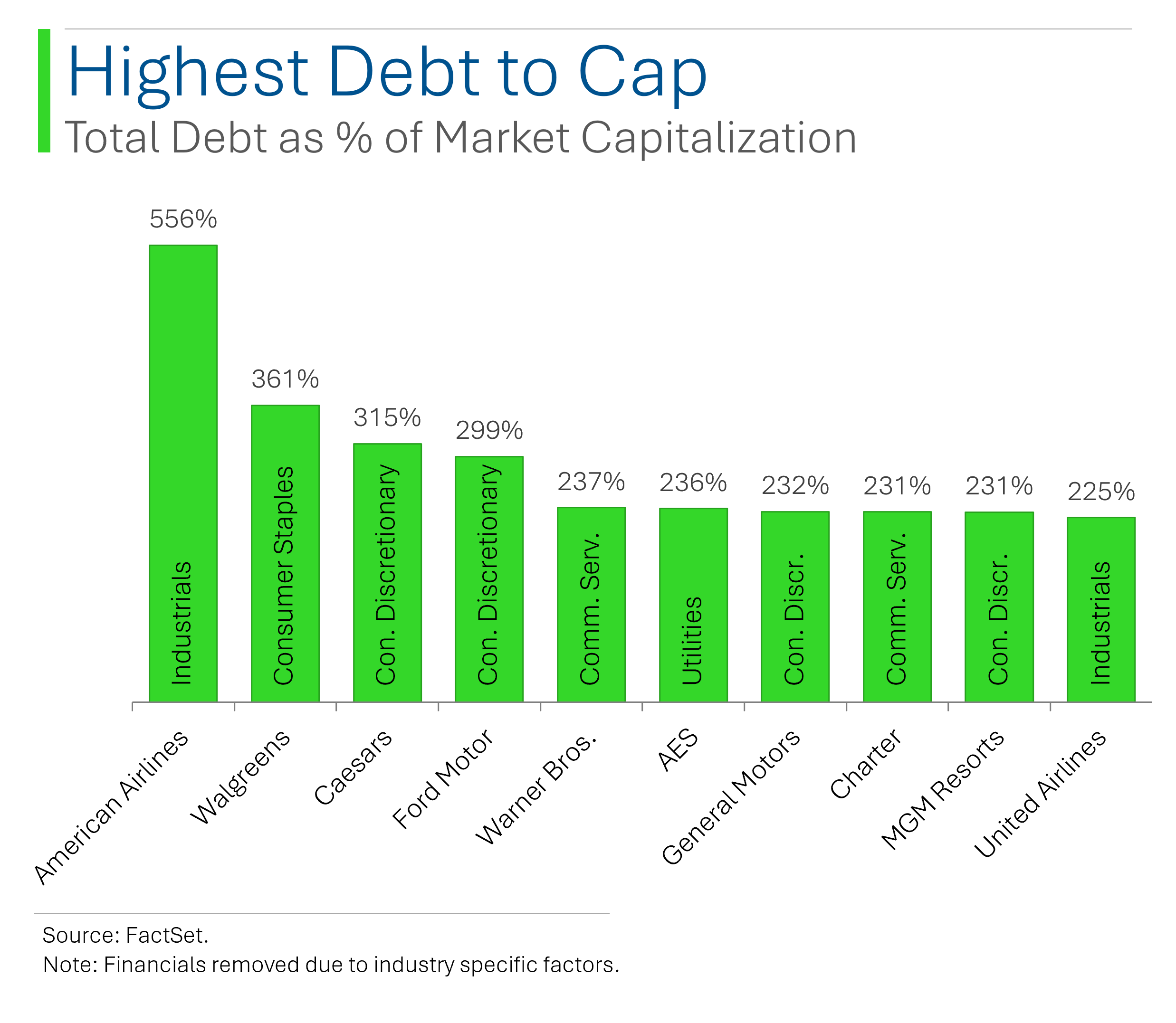 Now several of the companies above are there in part because of their massive debt loads - and the risks therein. As you can see, American Airlines, Delta Airlines, Ford, GM, Walgreen are also unhappily included in the Top 10 for highest debt as a percent of their market capitalization.