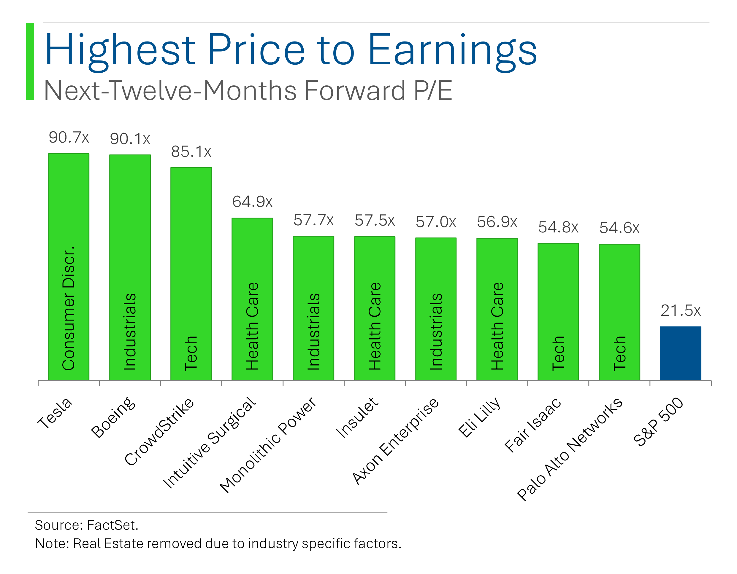 On the valuation front, Tesla actually has the highest 12-Month Forward P/E at 91x - roughly 4.2 times the S&P 500 average of 21.5x.