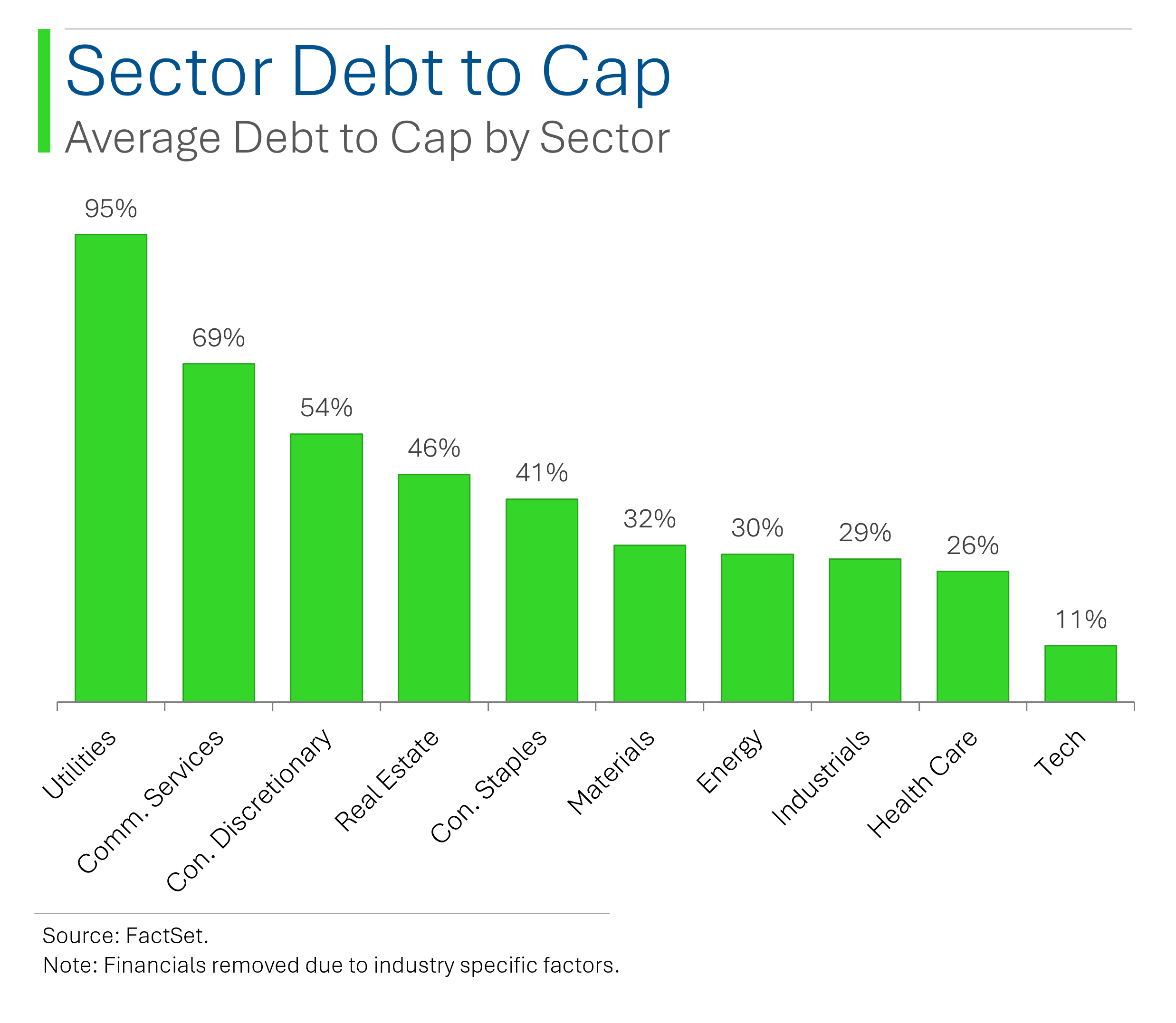 Sector-wise, Utilities quite reasonably has the highest debt as a percent of market cap (tightly regulated industries can do that). While Tech has the lowest by a fair margin.